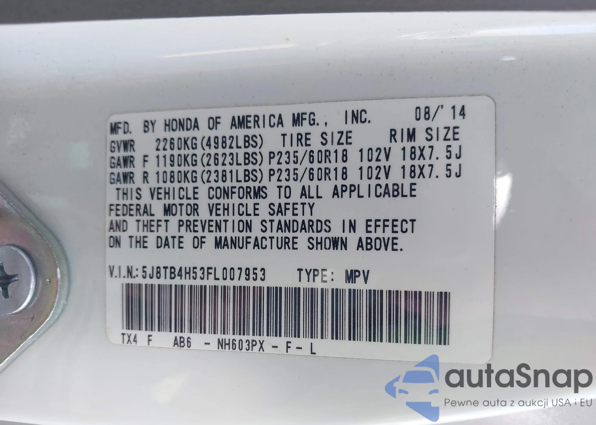 • VIN 5J8TB4H53FL007953
