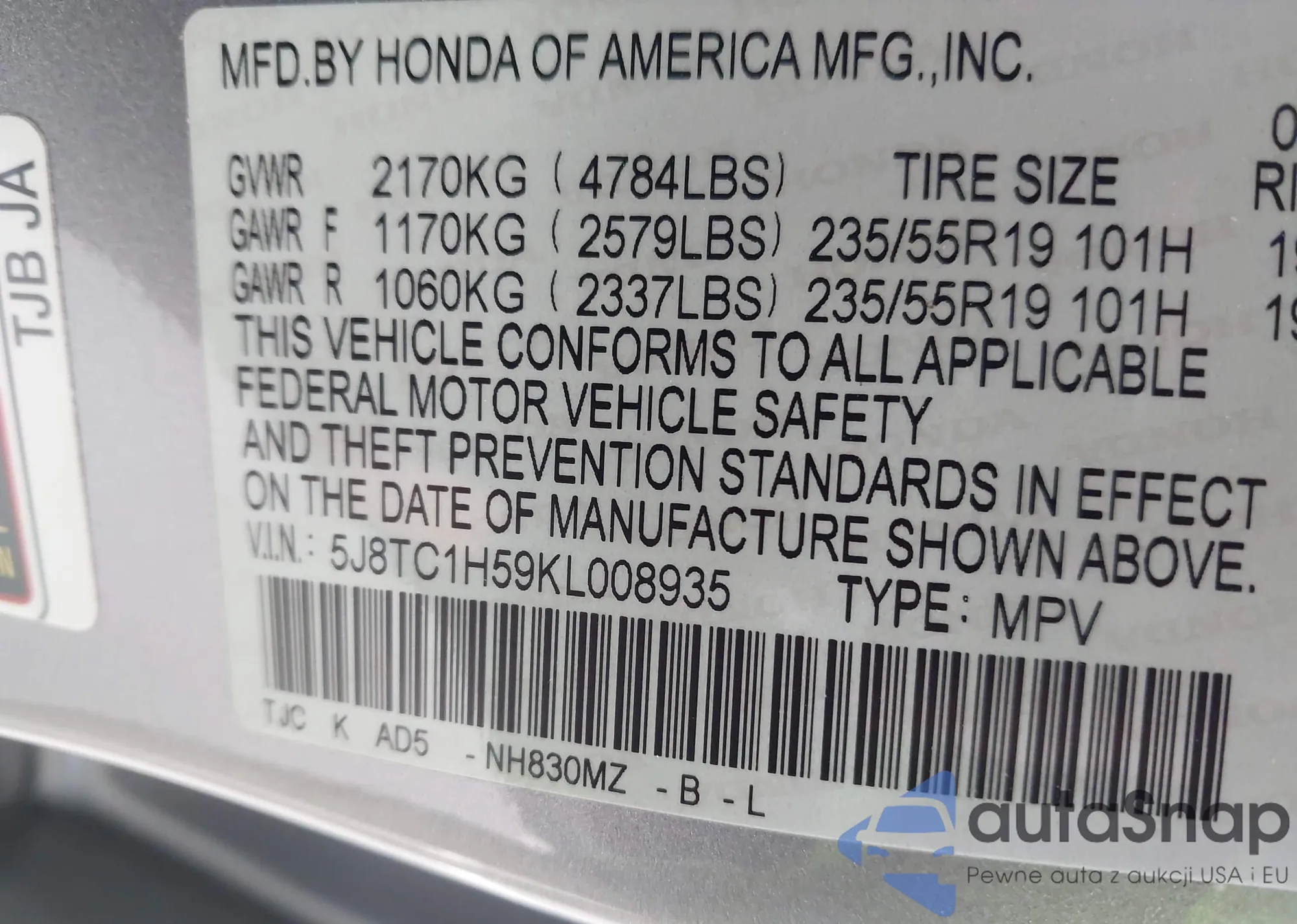 • VIN 5J8TC1H59KL008935