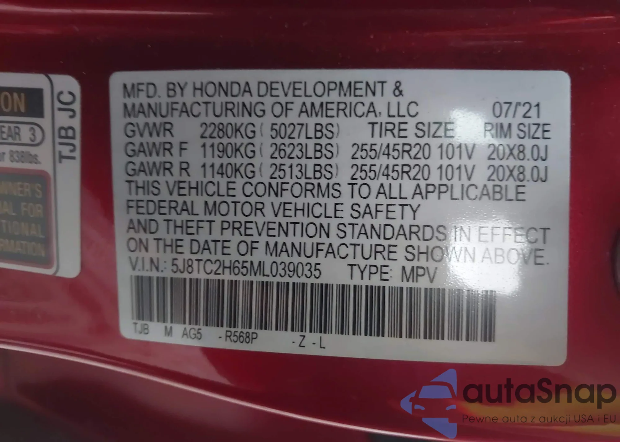 • VIN 5J8TC2H65ML039035