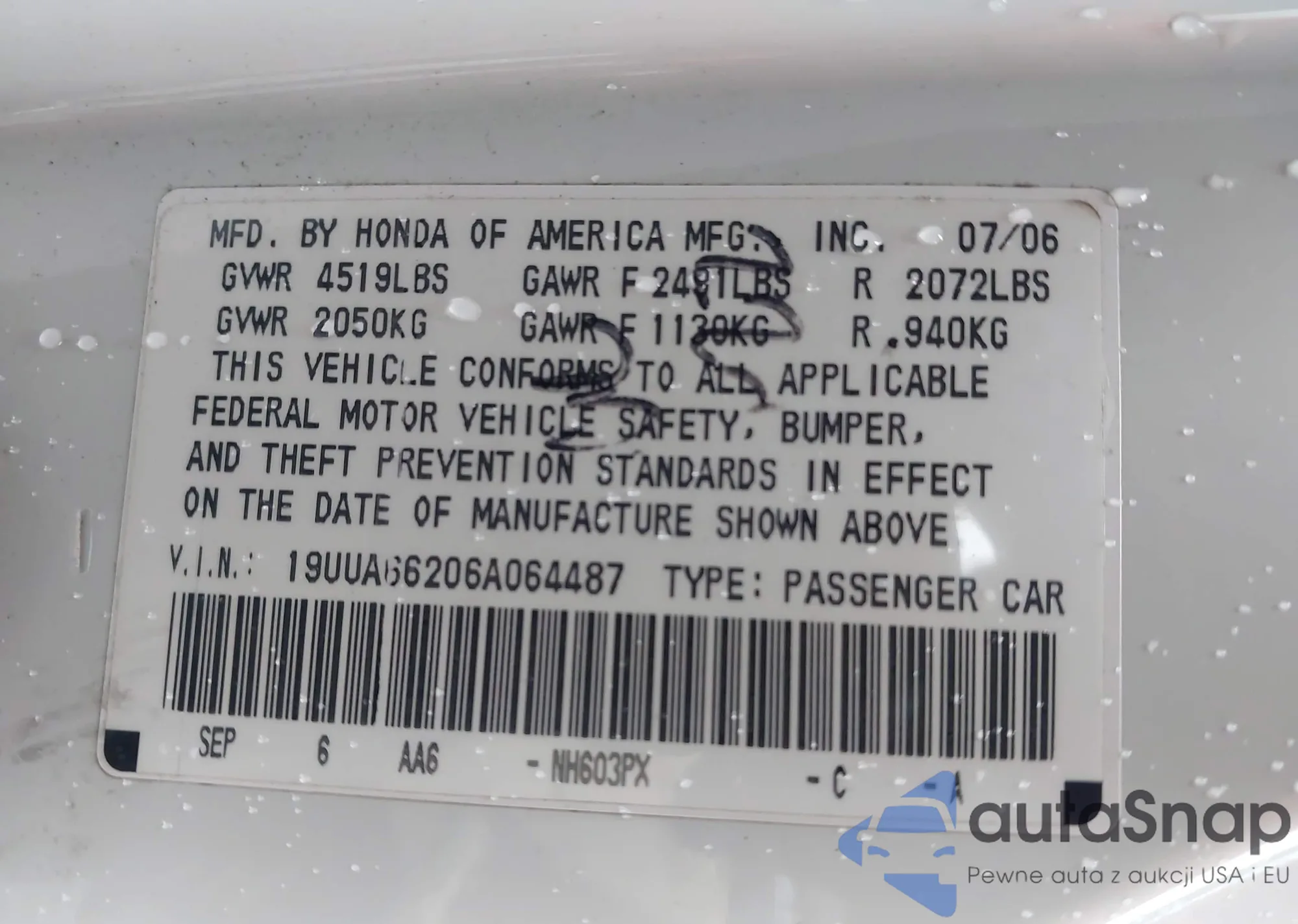 LOT: 91384805 VIN: 19UUA66266A053283