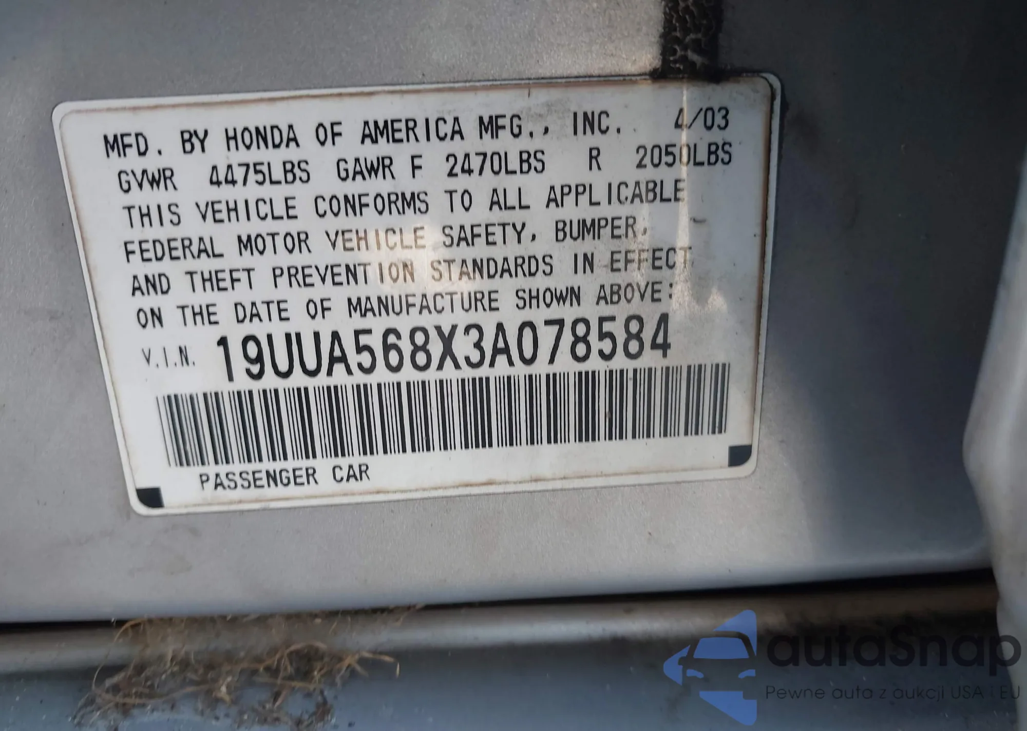 • VIN 19UUA568X3A078584