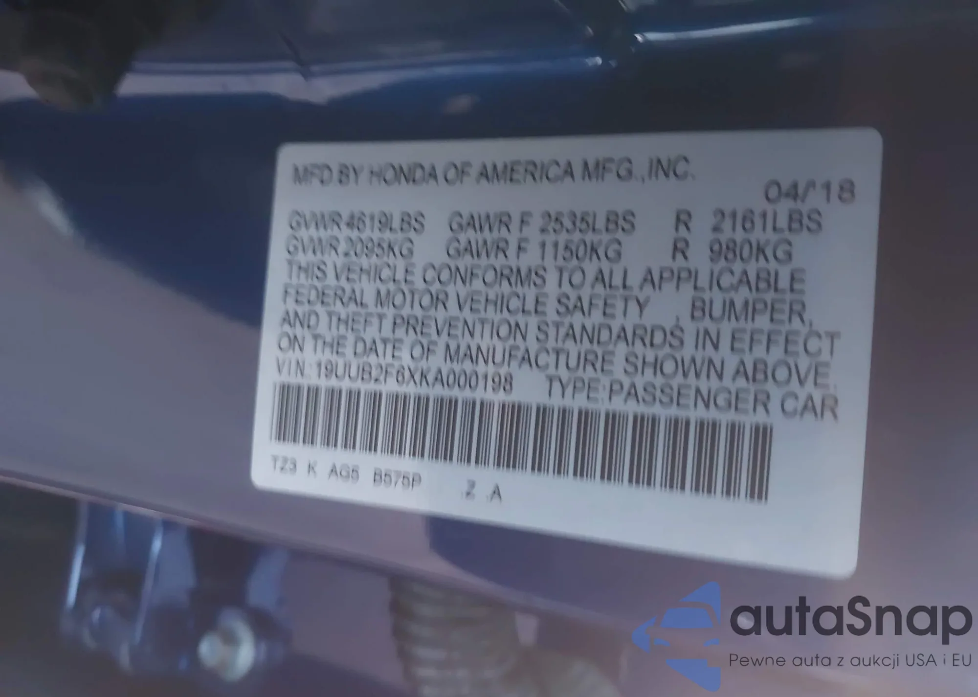 LOT: 44259870 VIN: 19UUB1F38JA008010