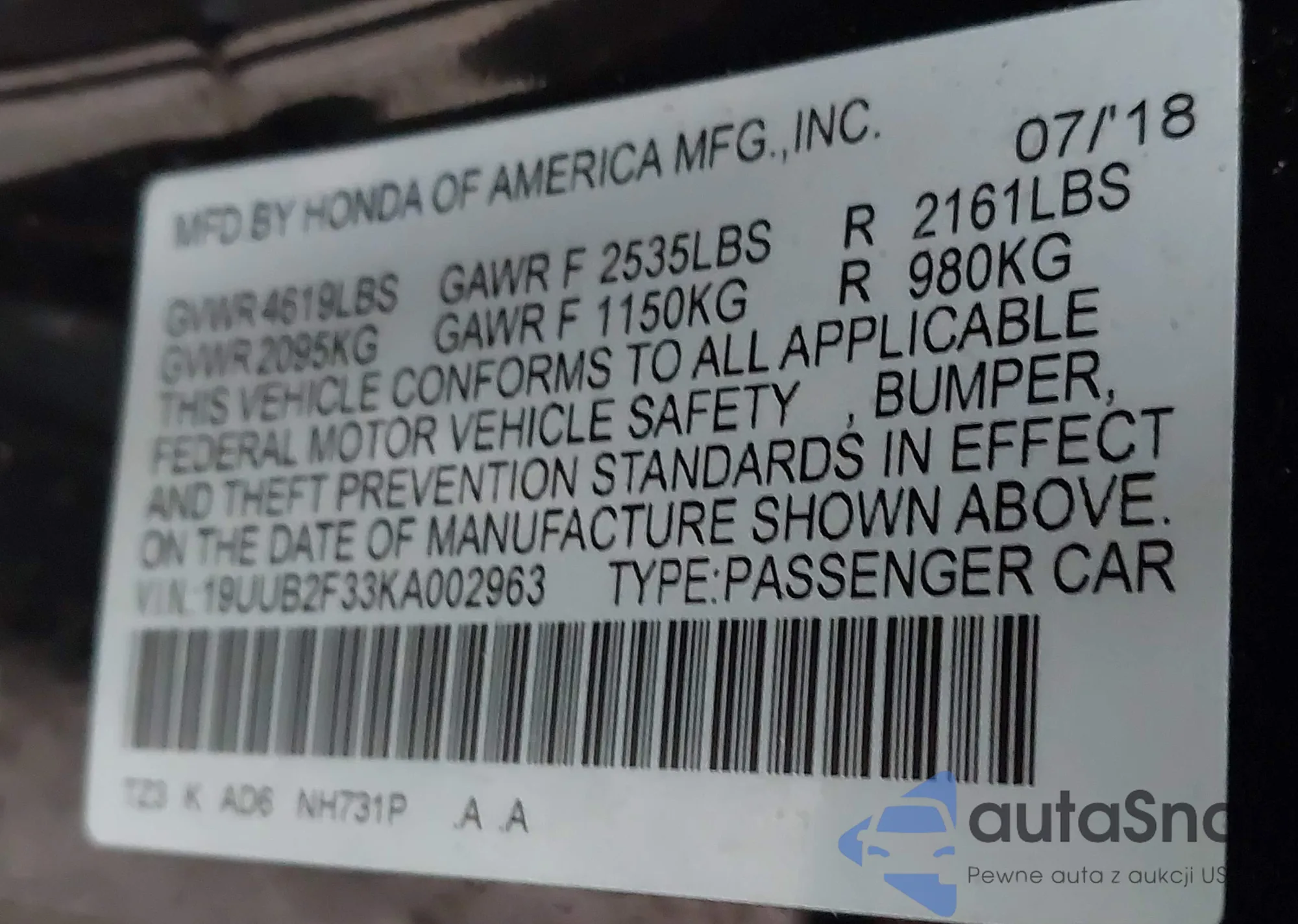 • VIN 19UUB2F33KA002963