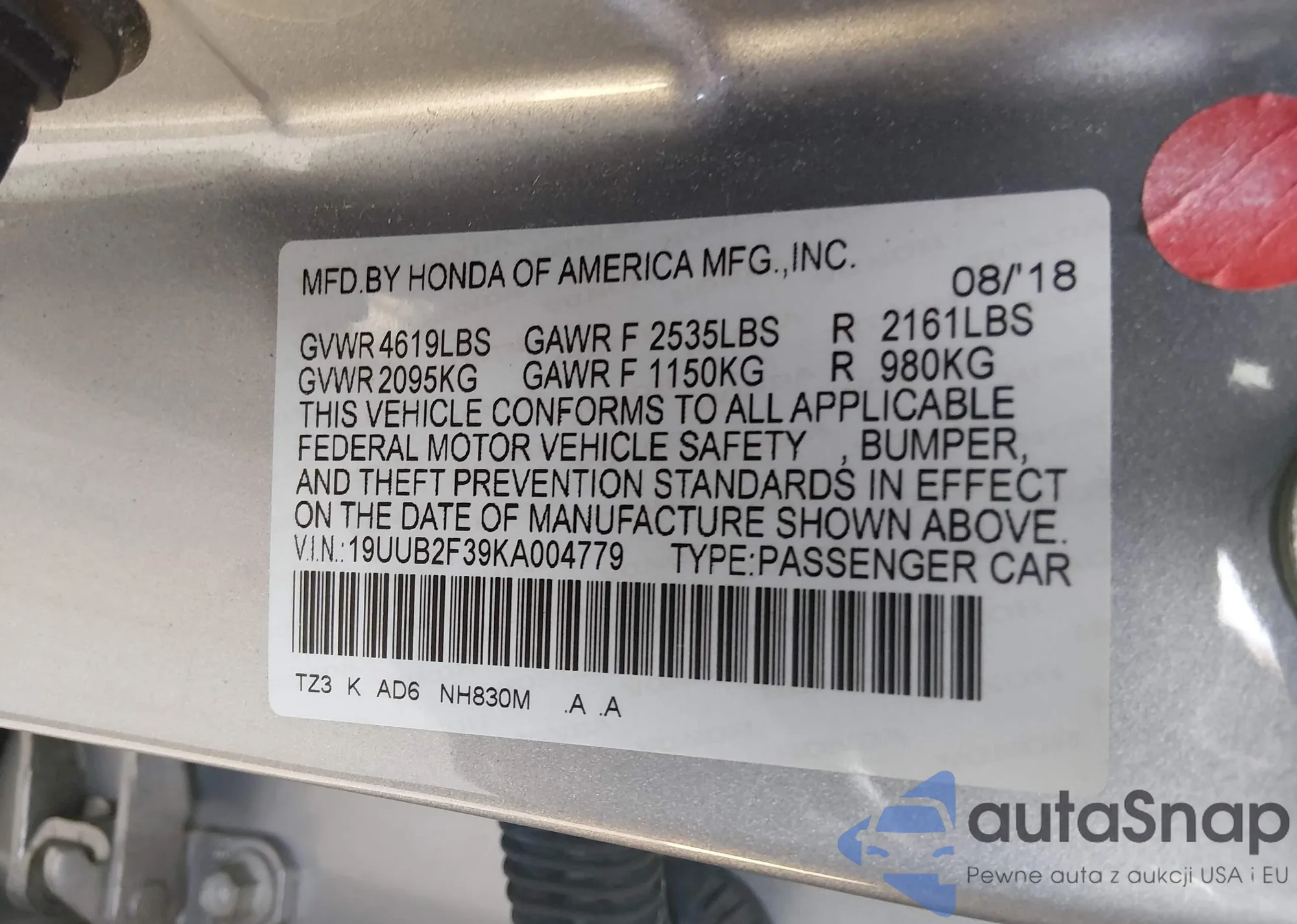 • VIN 19UUB2F39KA004779