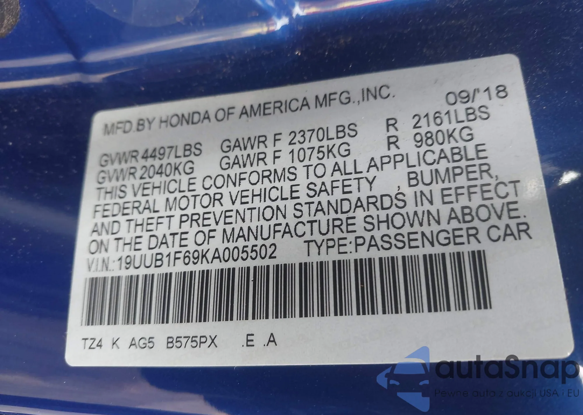• VIN 19UUB1F69KA005502