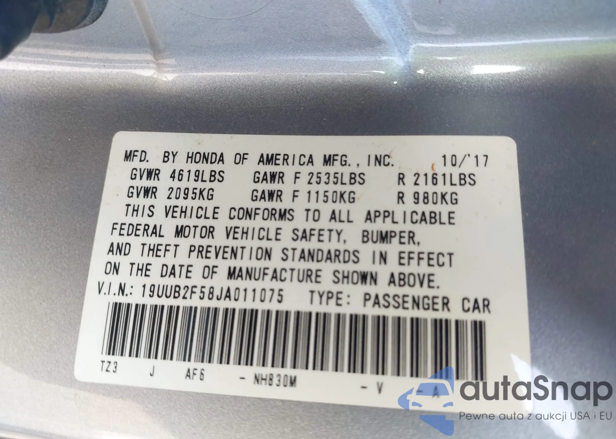 • VIN 19UUB2F58JA011075