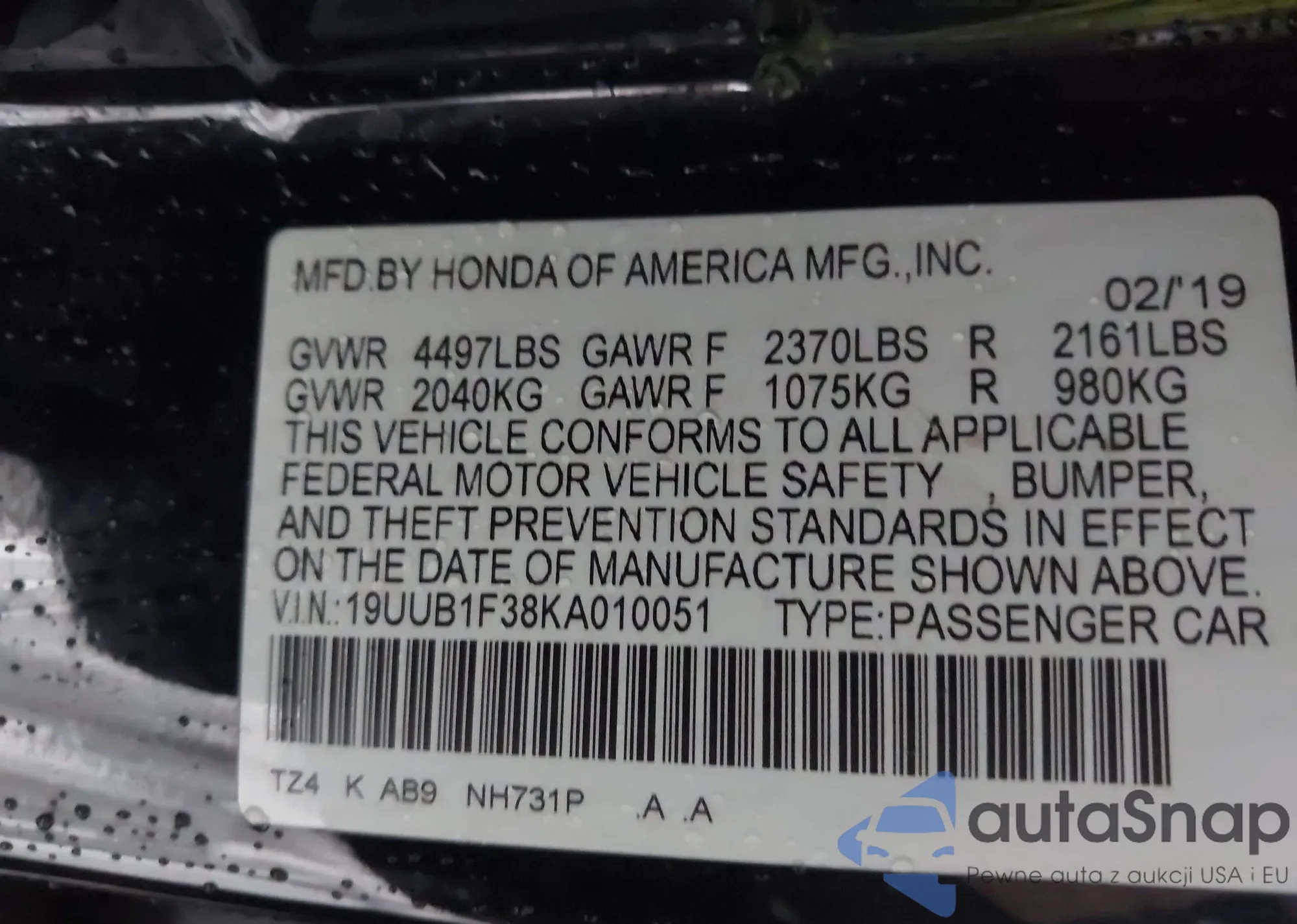 • VIN 19UUB1F38KA010051