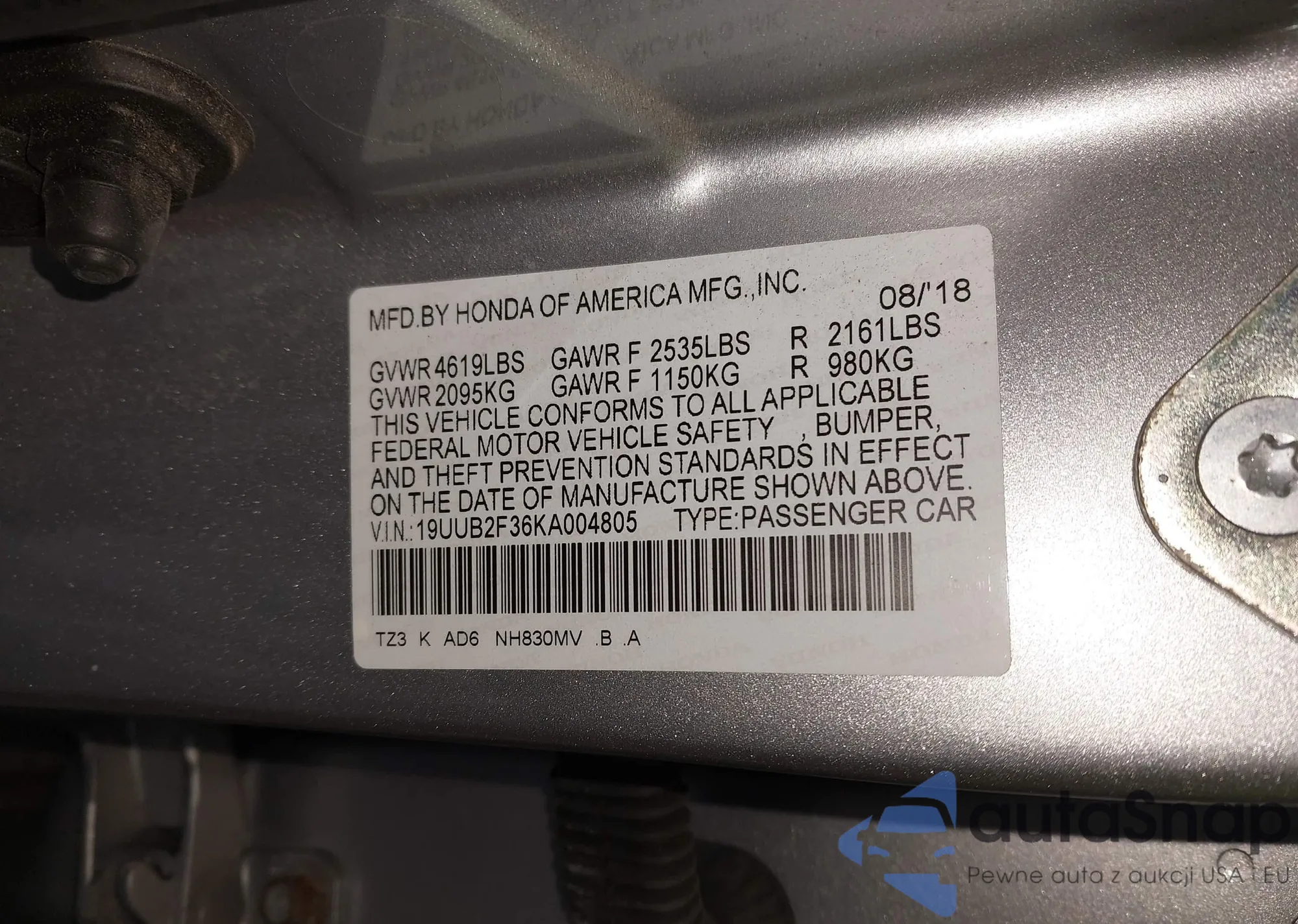 • VIN 19UUB2F36KA004805