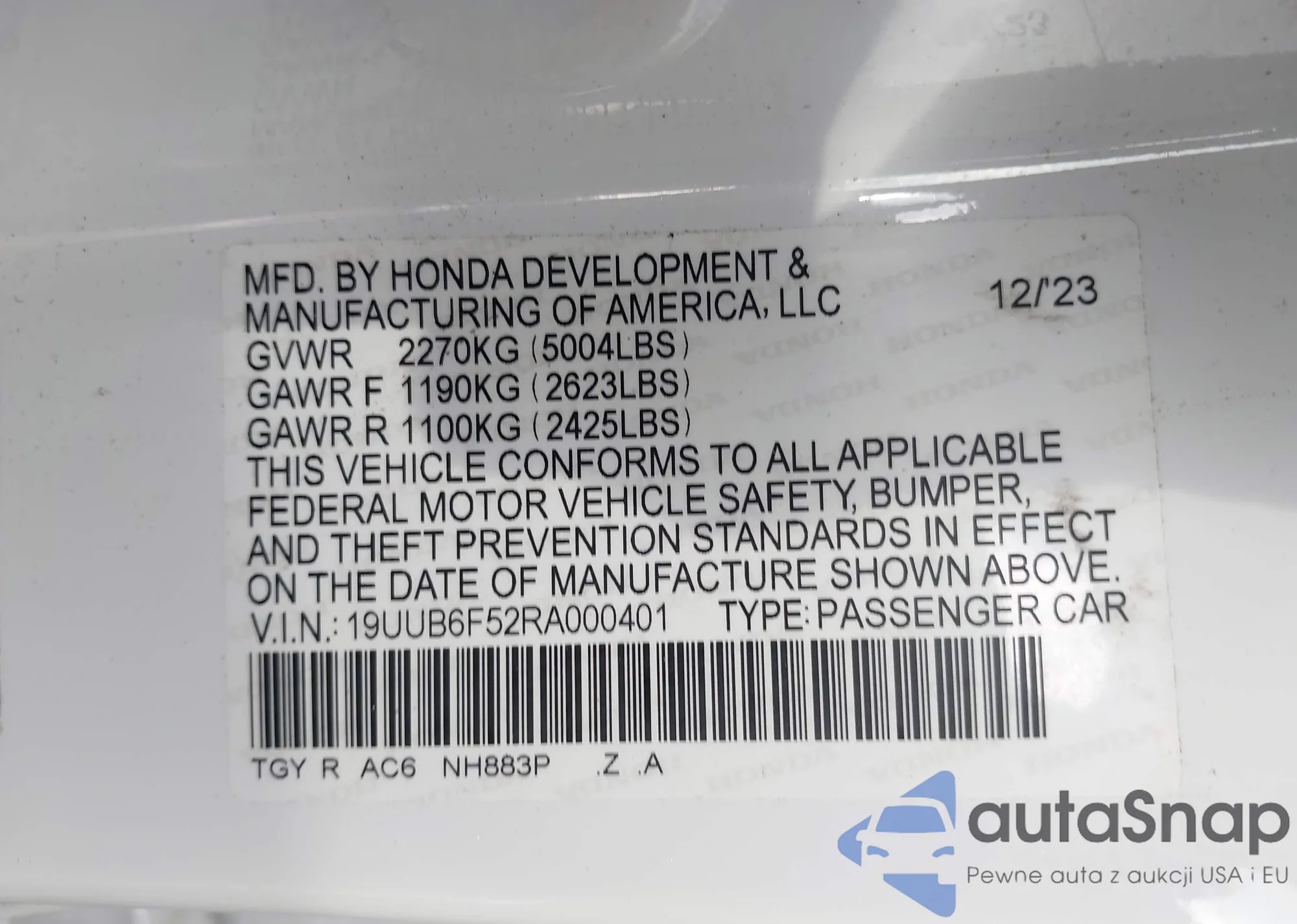 LOT: 43703103 VIN: 19UUB6F52RA000401