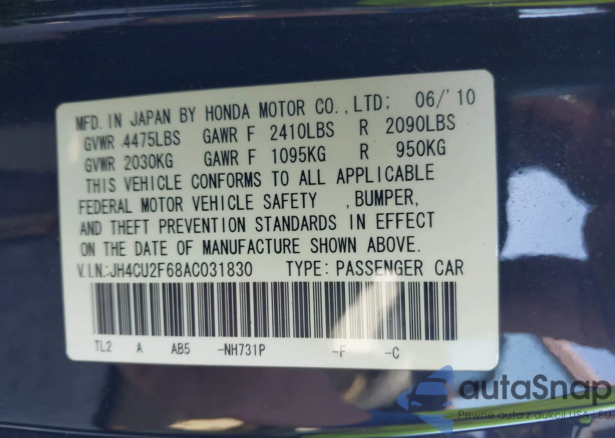 LOT: 43530712 VIN: JH4CU2F68AC009648