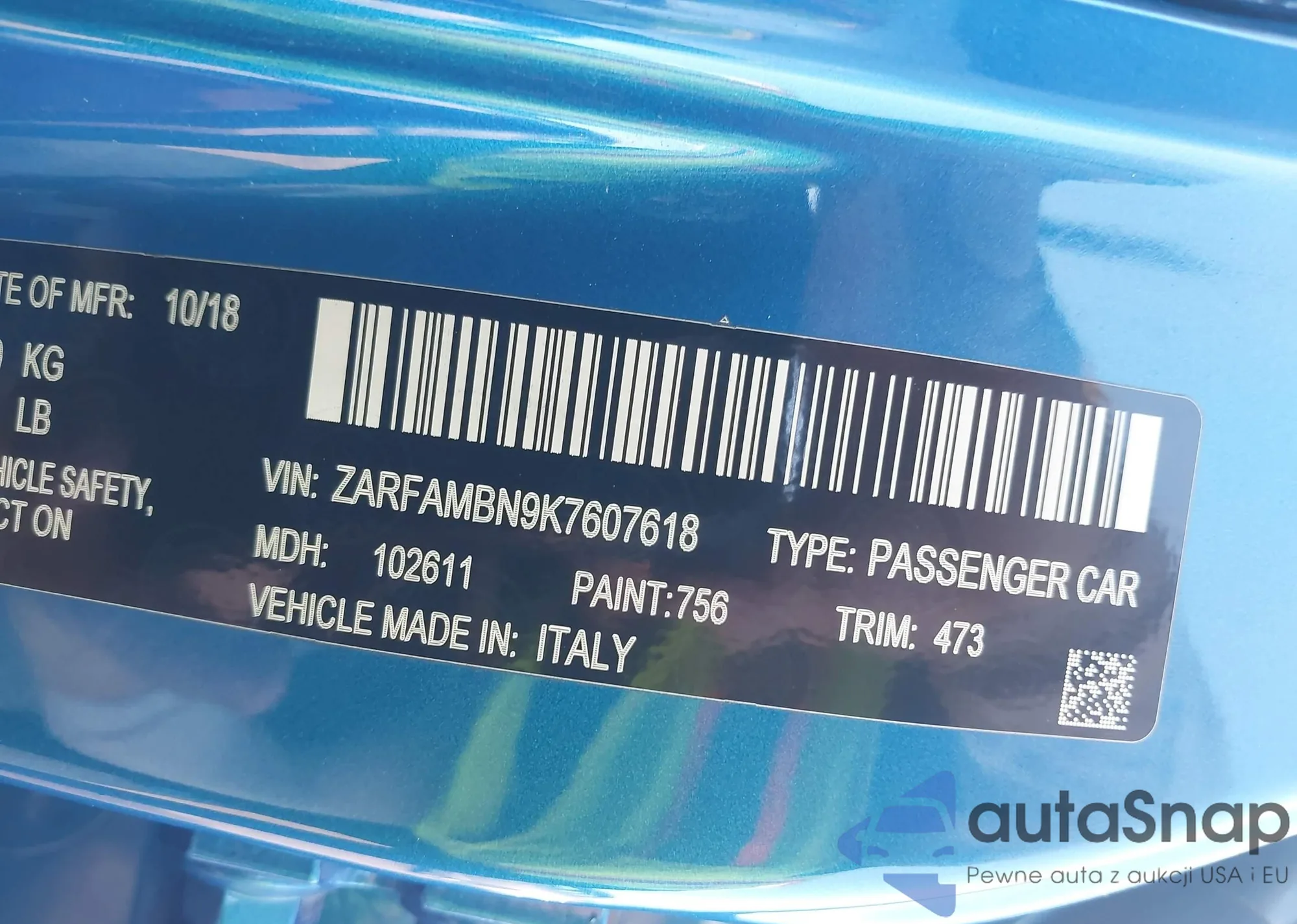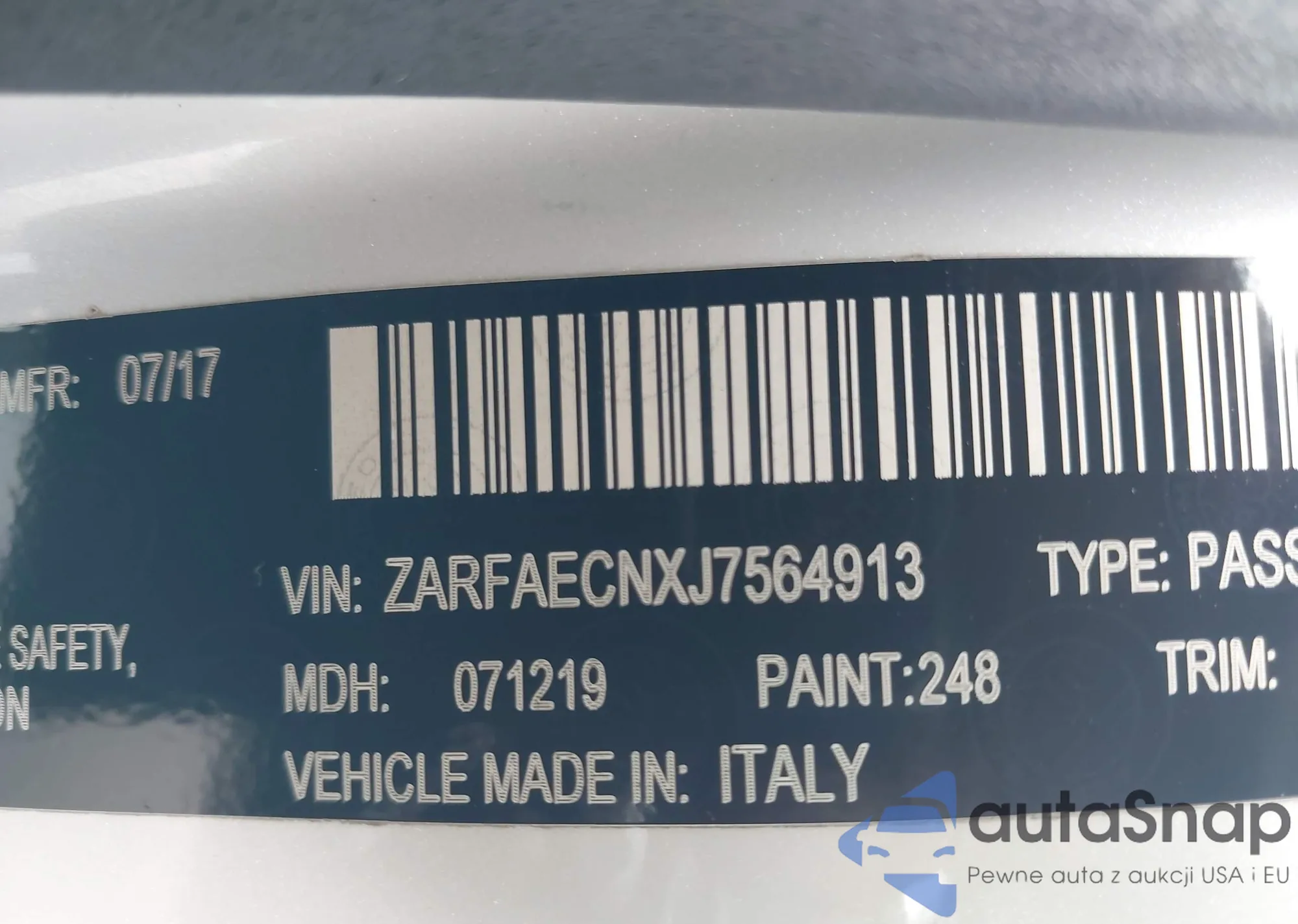 LOT: 44183923 VIN: ZARFAECNXJ7564913
