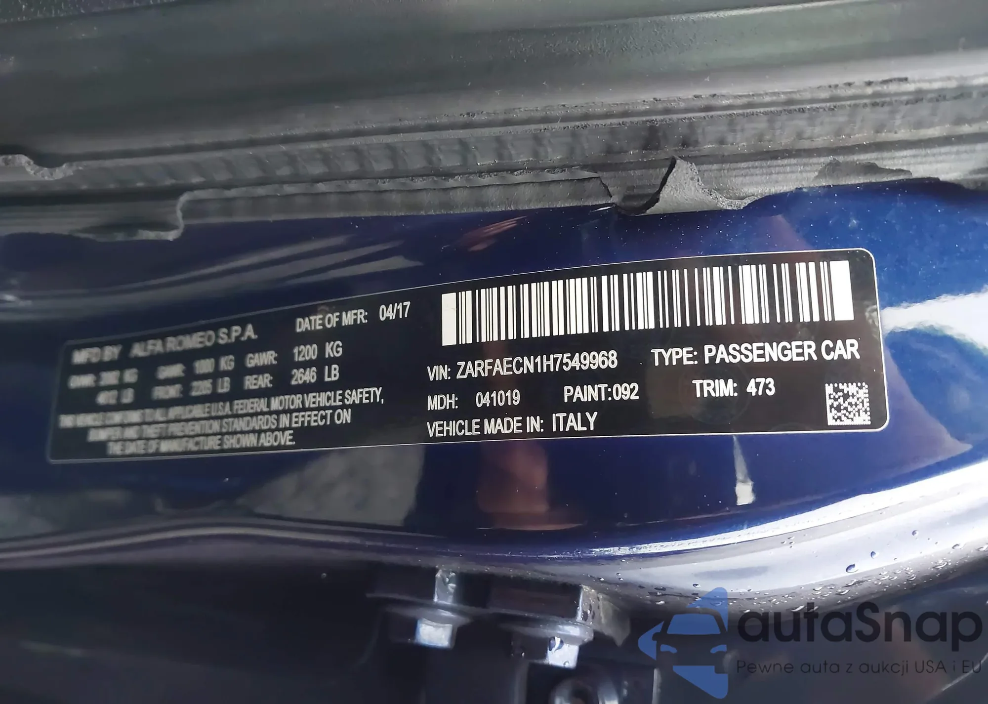 LOT: 44203479 VIN: ZARFAECN1H7549968