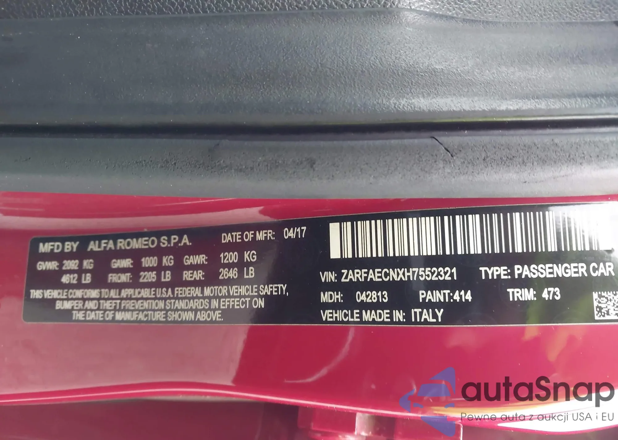 LOT: 44640454 VIN: ZARFAECNXH7552321
