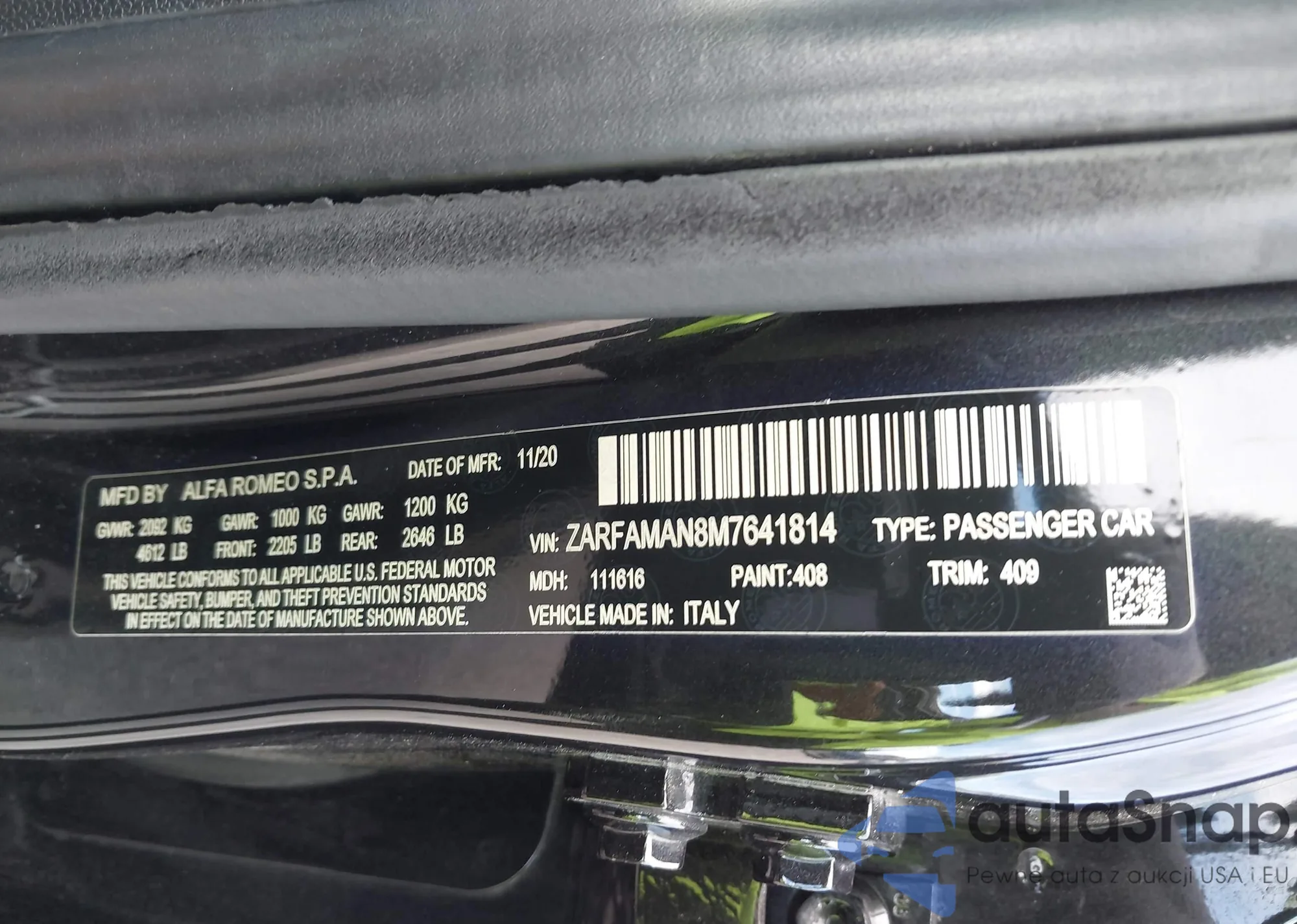 LOT: 44667076 VIN: ZARFAMAN8M7641814
