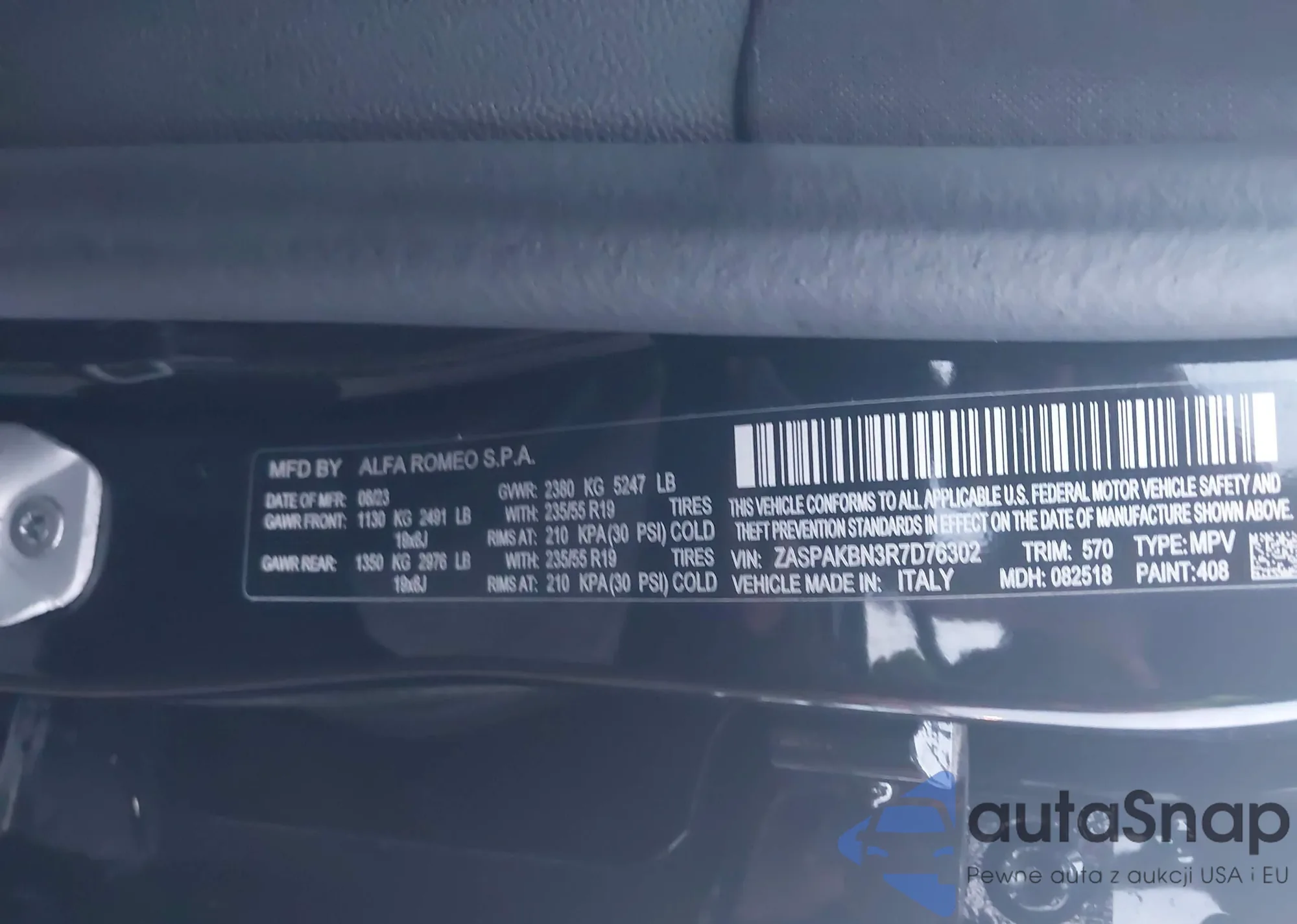 LOT: 44117424 VIN: ZASPAKBN3R7D76302