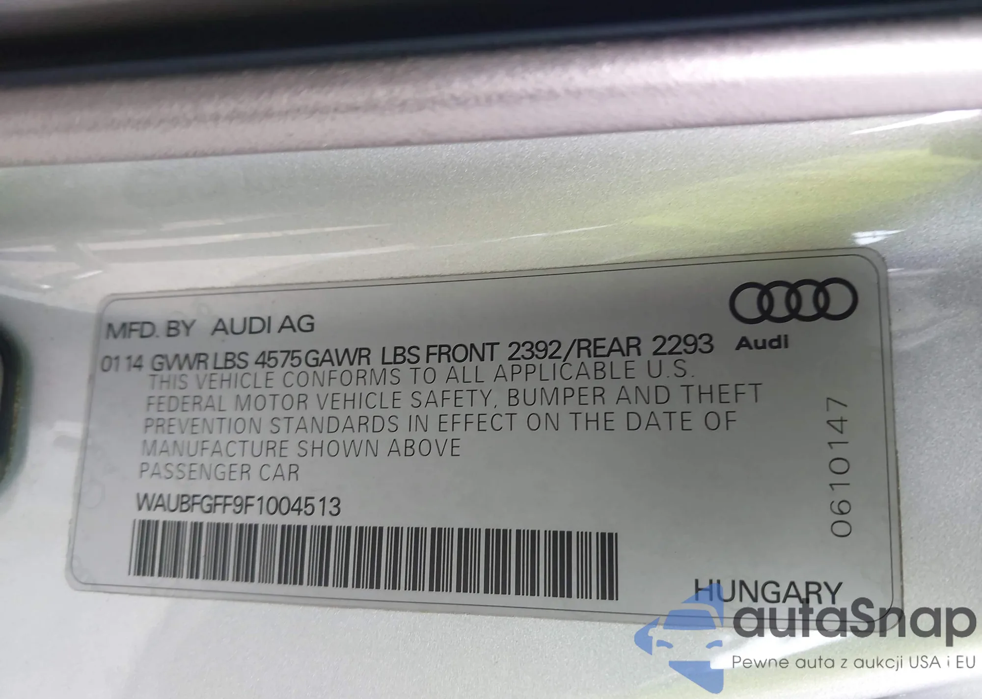 LOT: 44333143 VIN: WAUBFGFF9F1004513