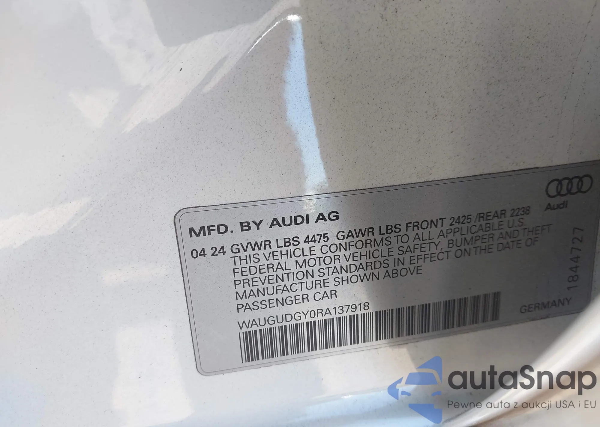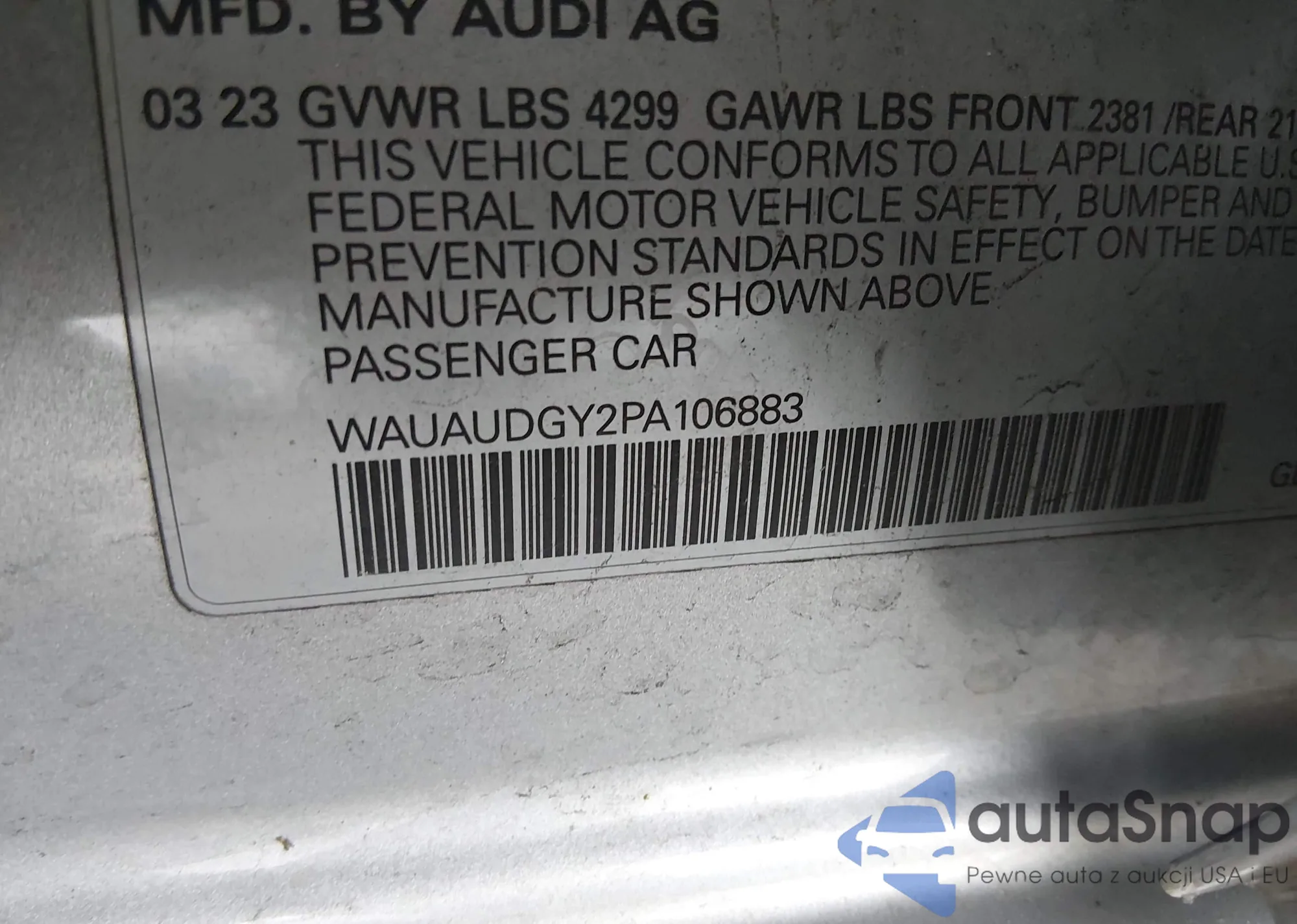 LOT: 44224107 VIN: WAUGUDGY7PA148203