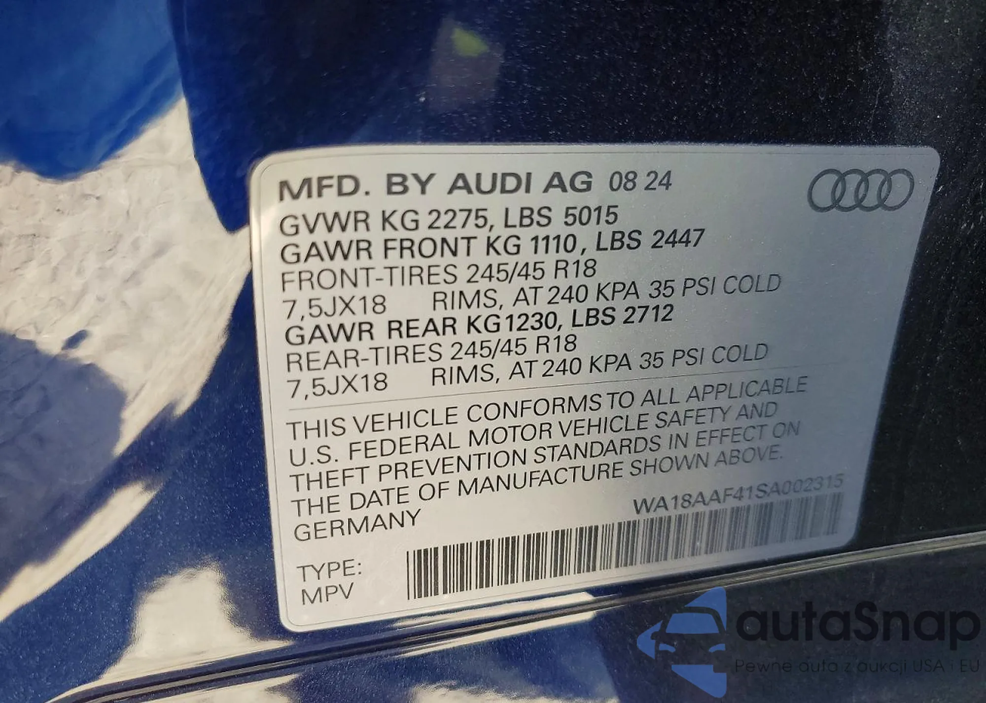 • VIN WA18AAF41SA002315