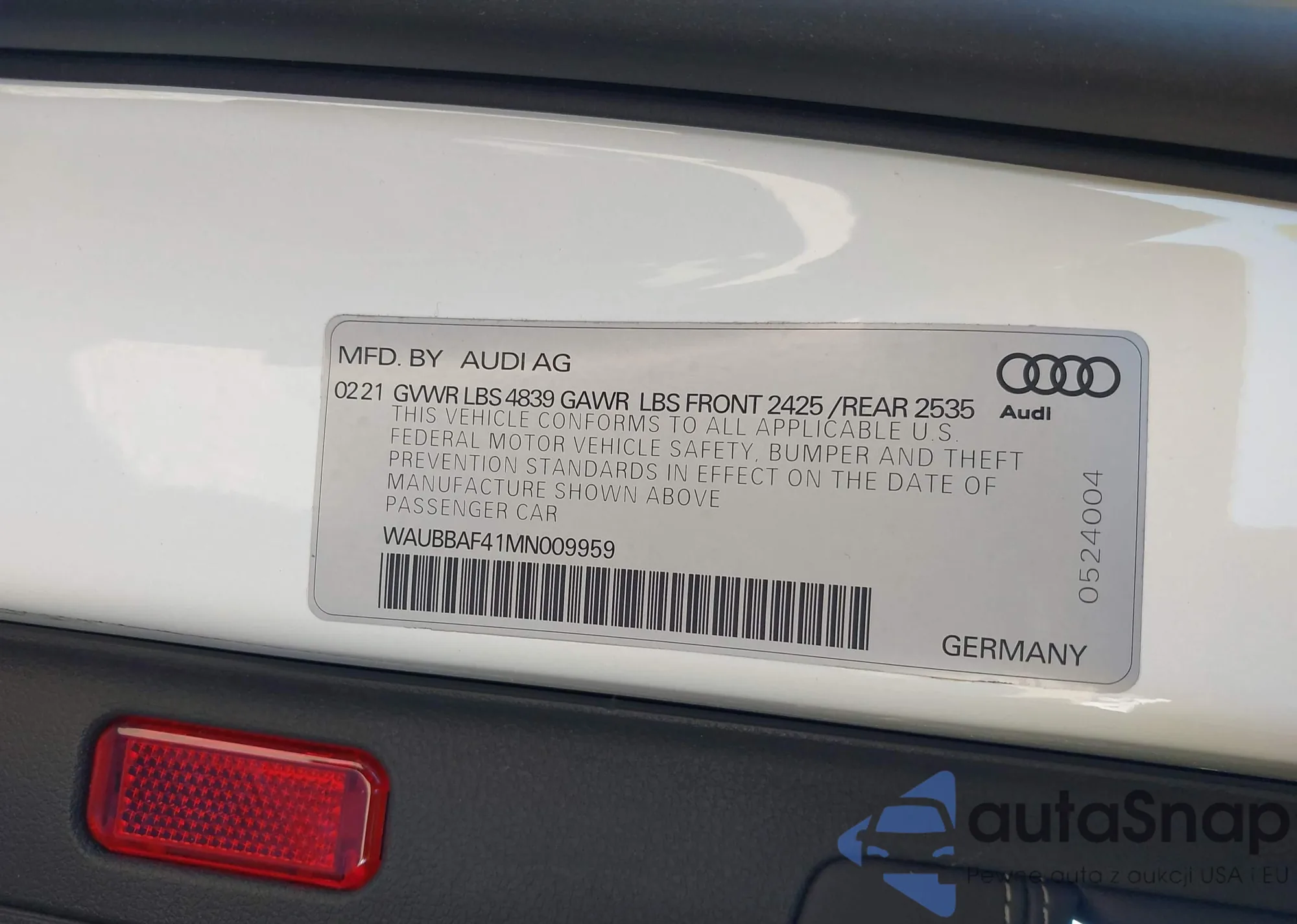 LOT: 43898338 VIN: WAUBBAF41MN009959