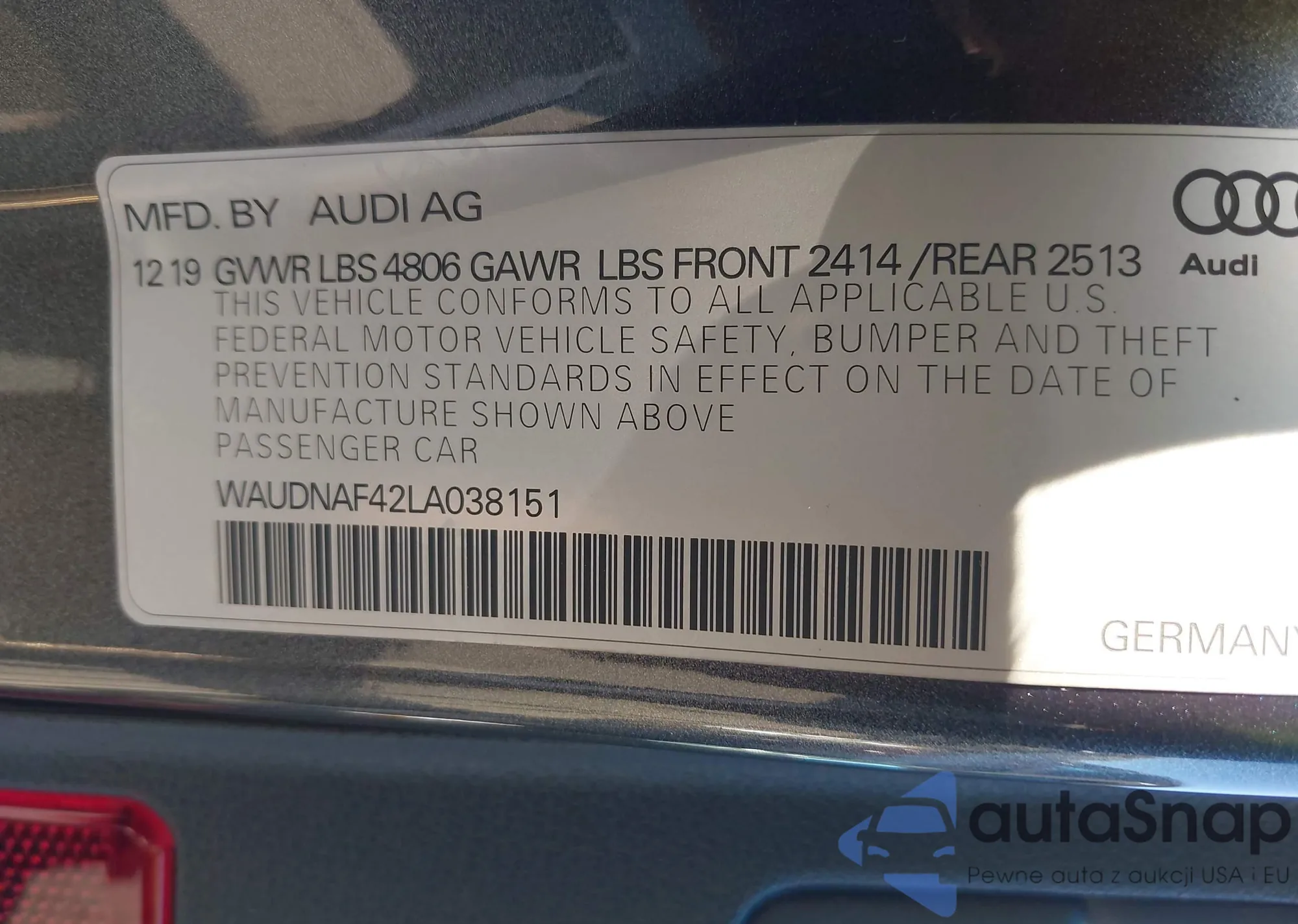 LOT: 44099310 VIN: WAUDNAF42LA038151