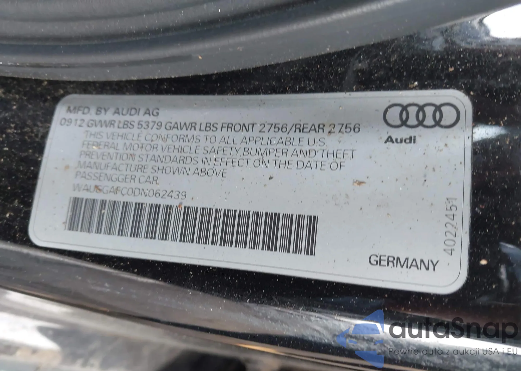 LOT: 44225289 VIN: WAUGGAFC0DN062439