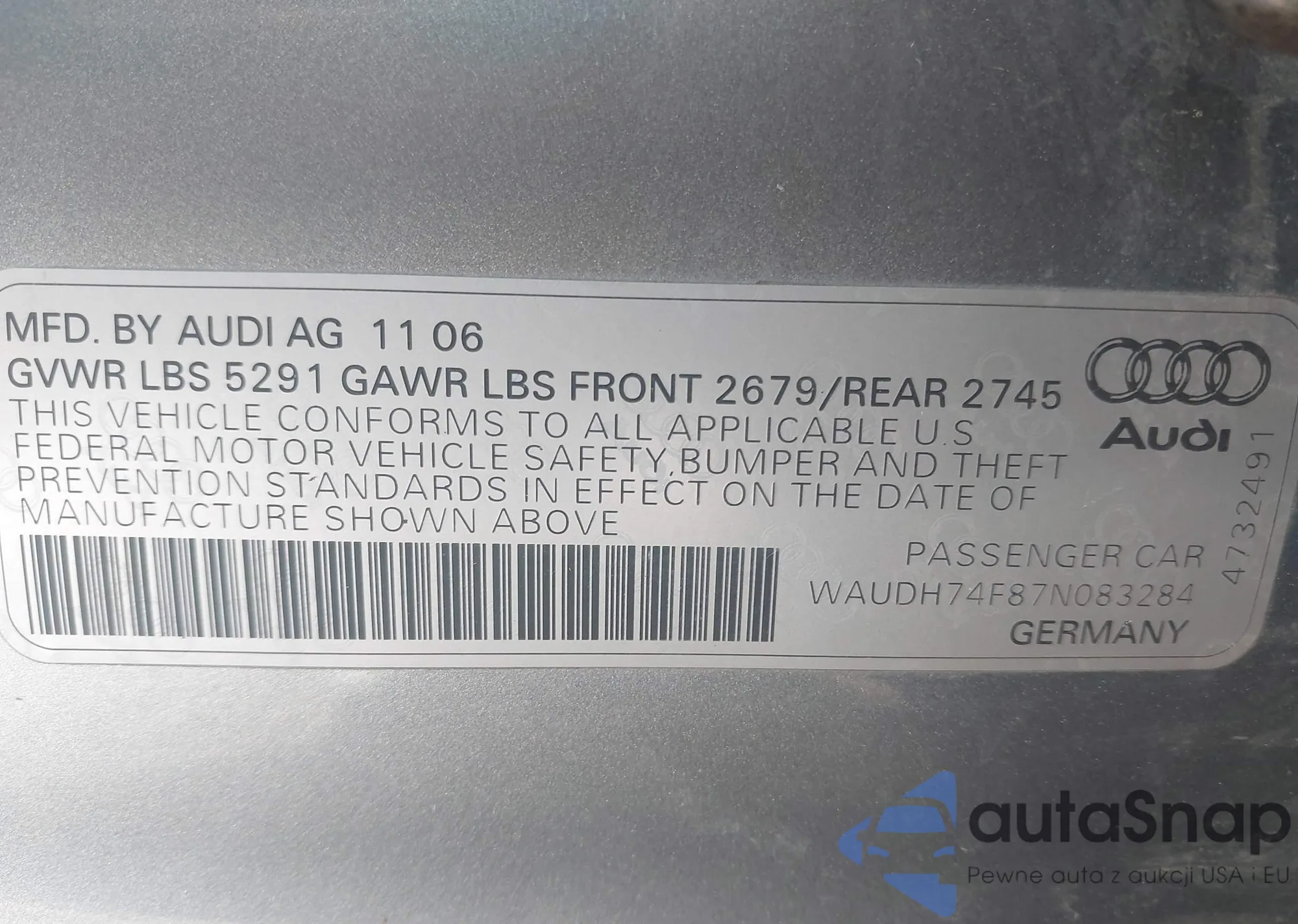 LOT: 44291391 VIN: WAUDH74F87N083284