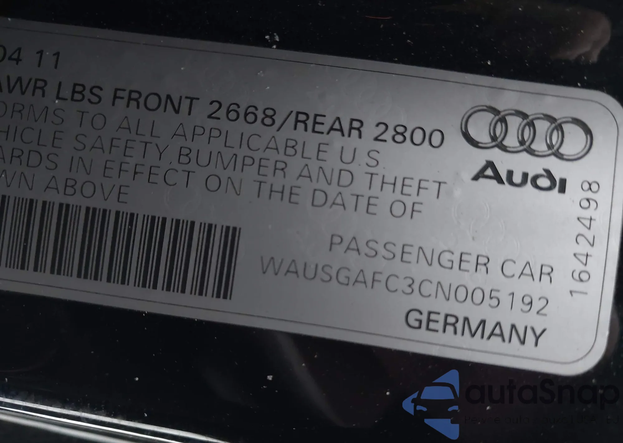 LOT: 44388745 VIN: WAUSGAFC3CN005192