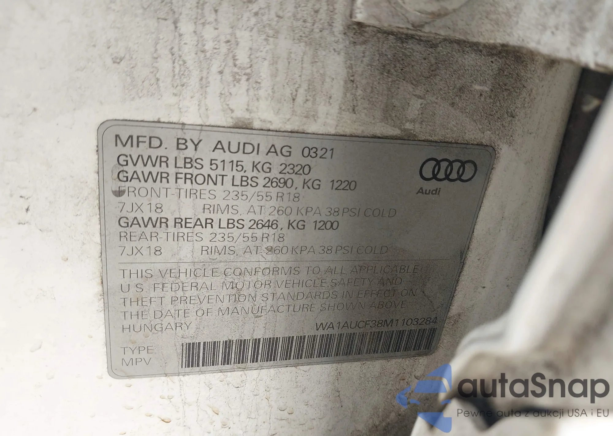 LOT: 44485109 VIN: WA1AUCF38M1103284
