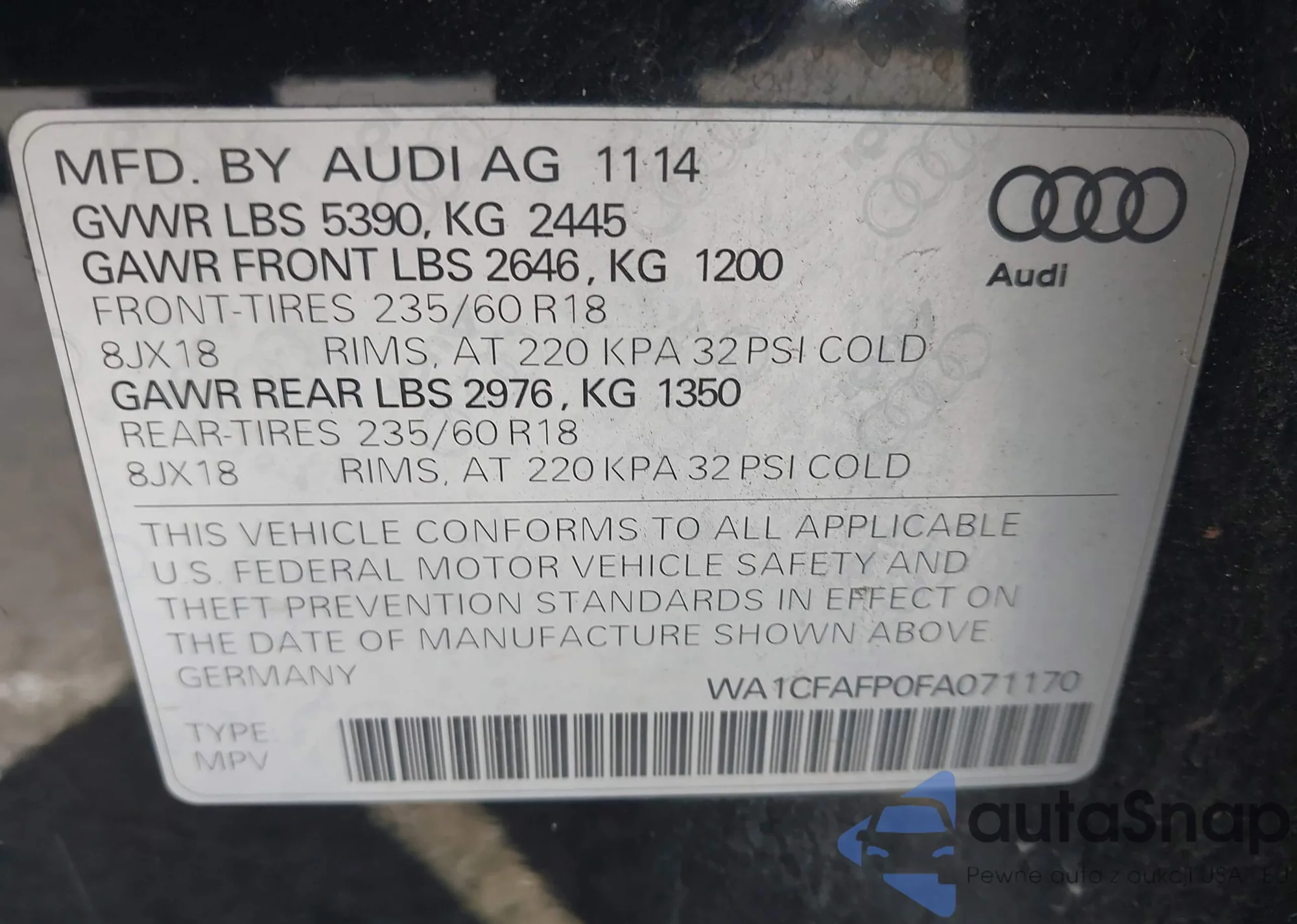 LOT: 43715103 VIN: WA1CFAFP0FA071170