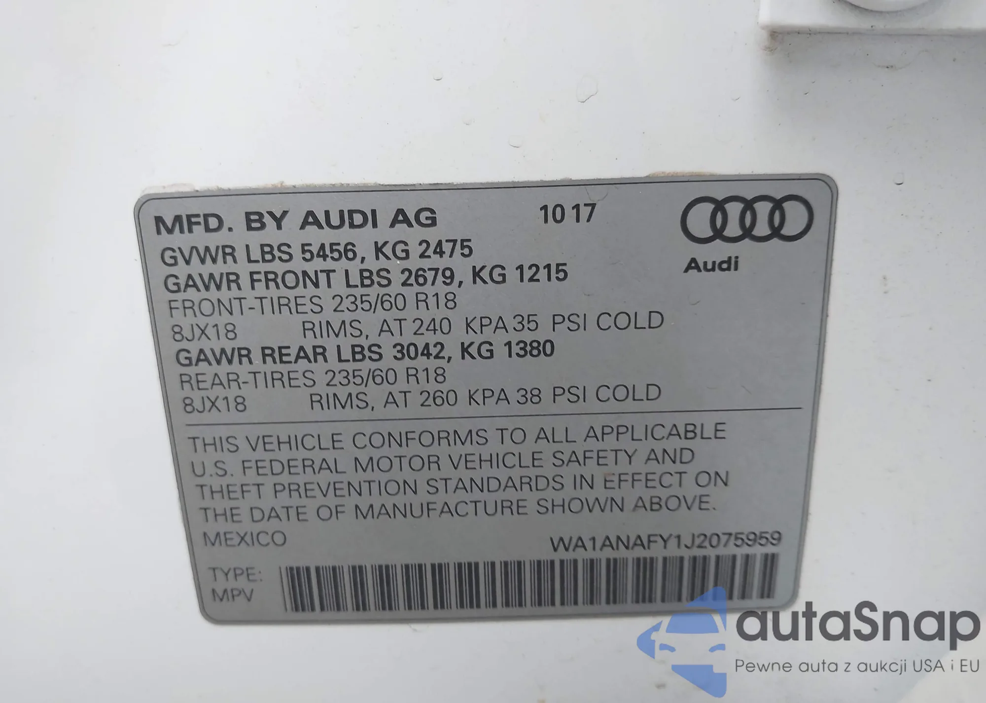 LOT: 44146633 VIN: WA1ANAFY1J2075959