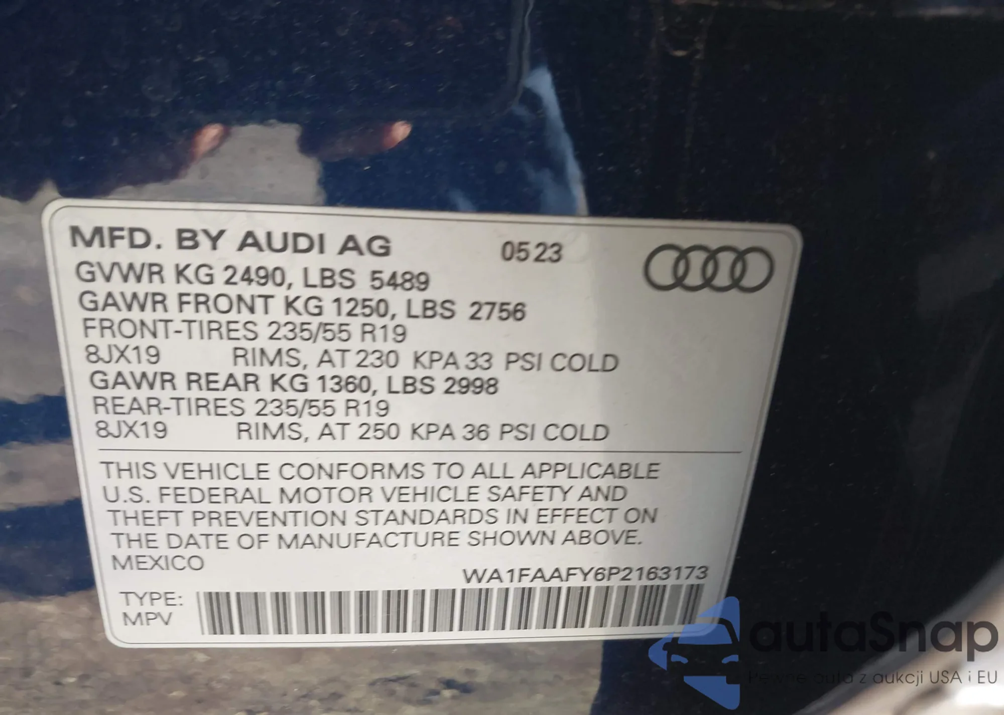 LOT: 43729832 VIN: WA1FAAFY6P2163173