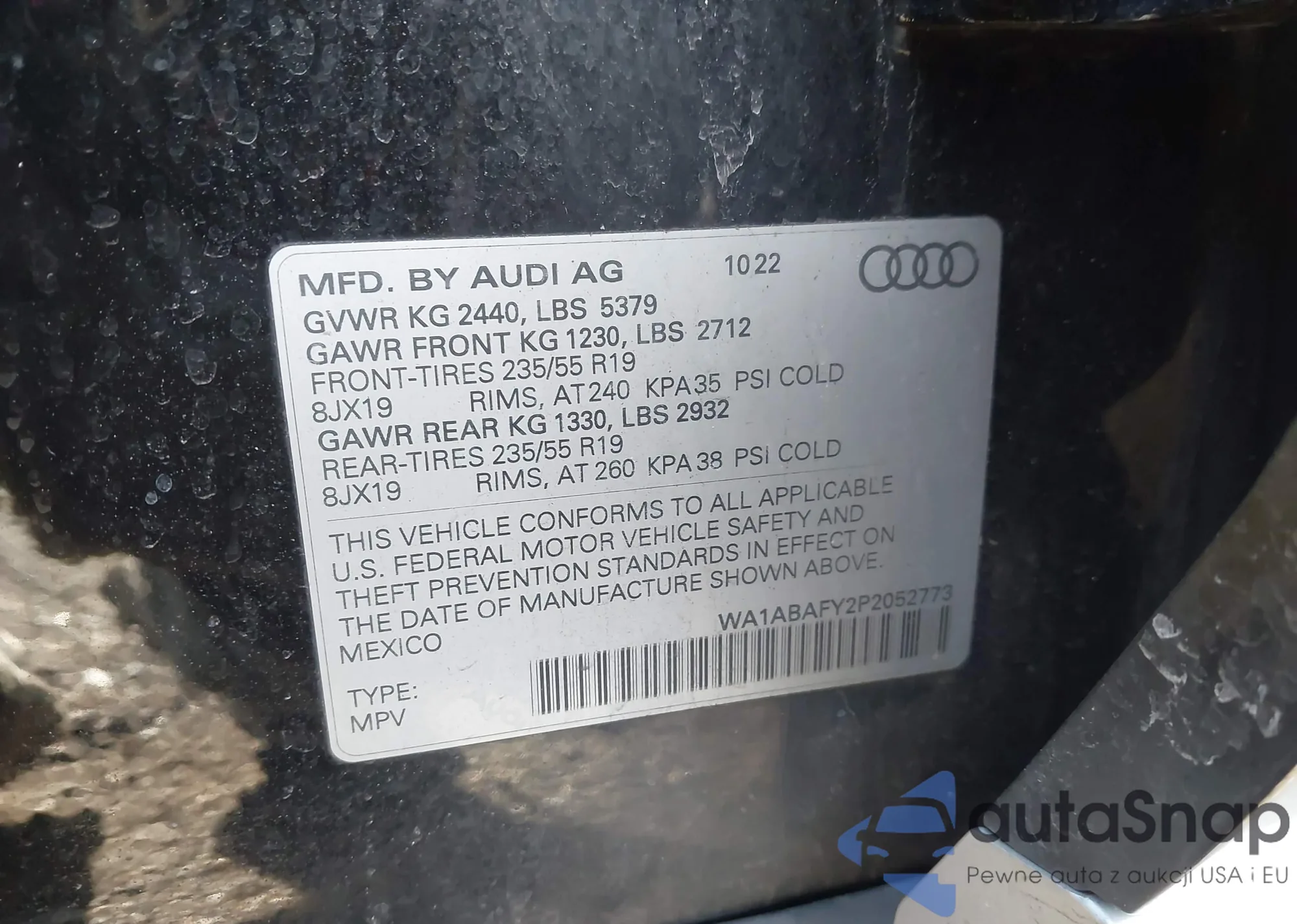LOT: 44023997 VIN: WA1VKAFP7AA047459