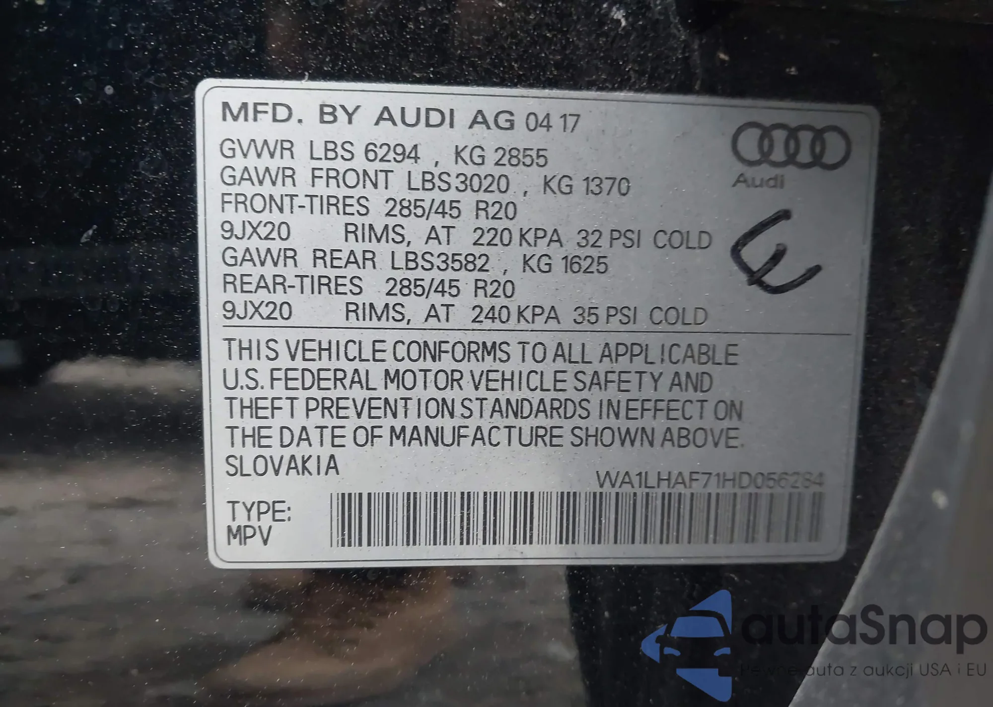 LOT: 43430005 VIN: WA1LAAF76JD013893