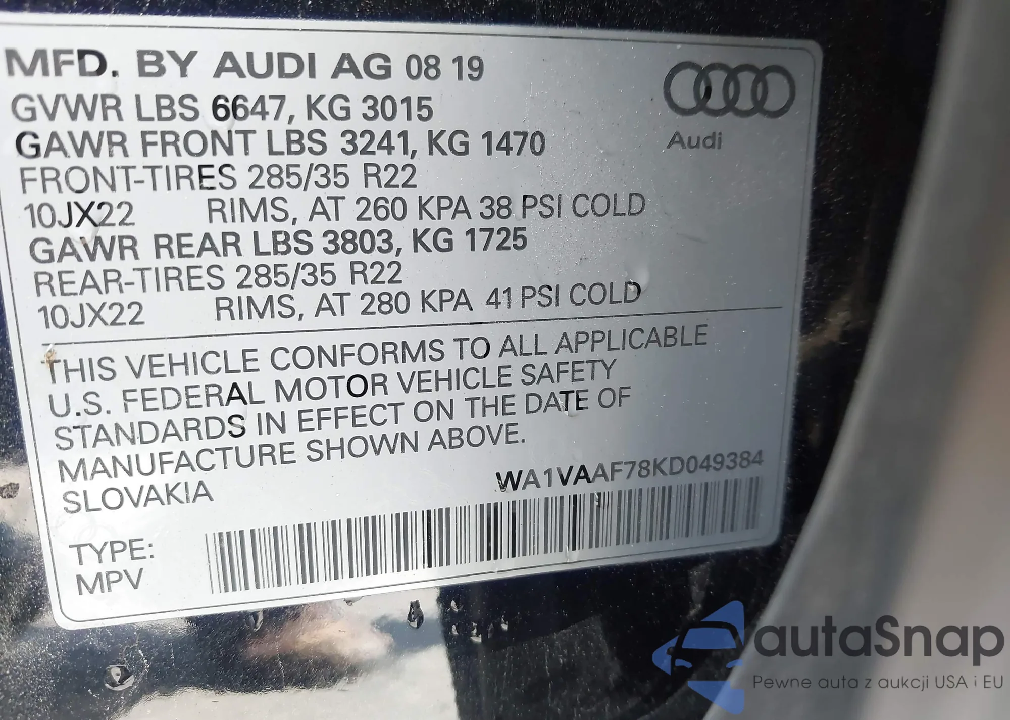 LOT: 44351475 VIN: WA1VAAF78KD049384