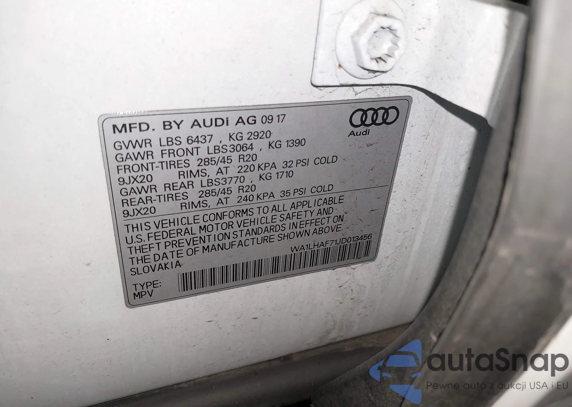 LOT: 44461281 VIN: WA1LAAF71JD005717