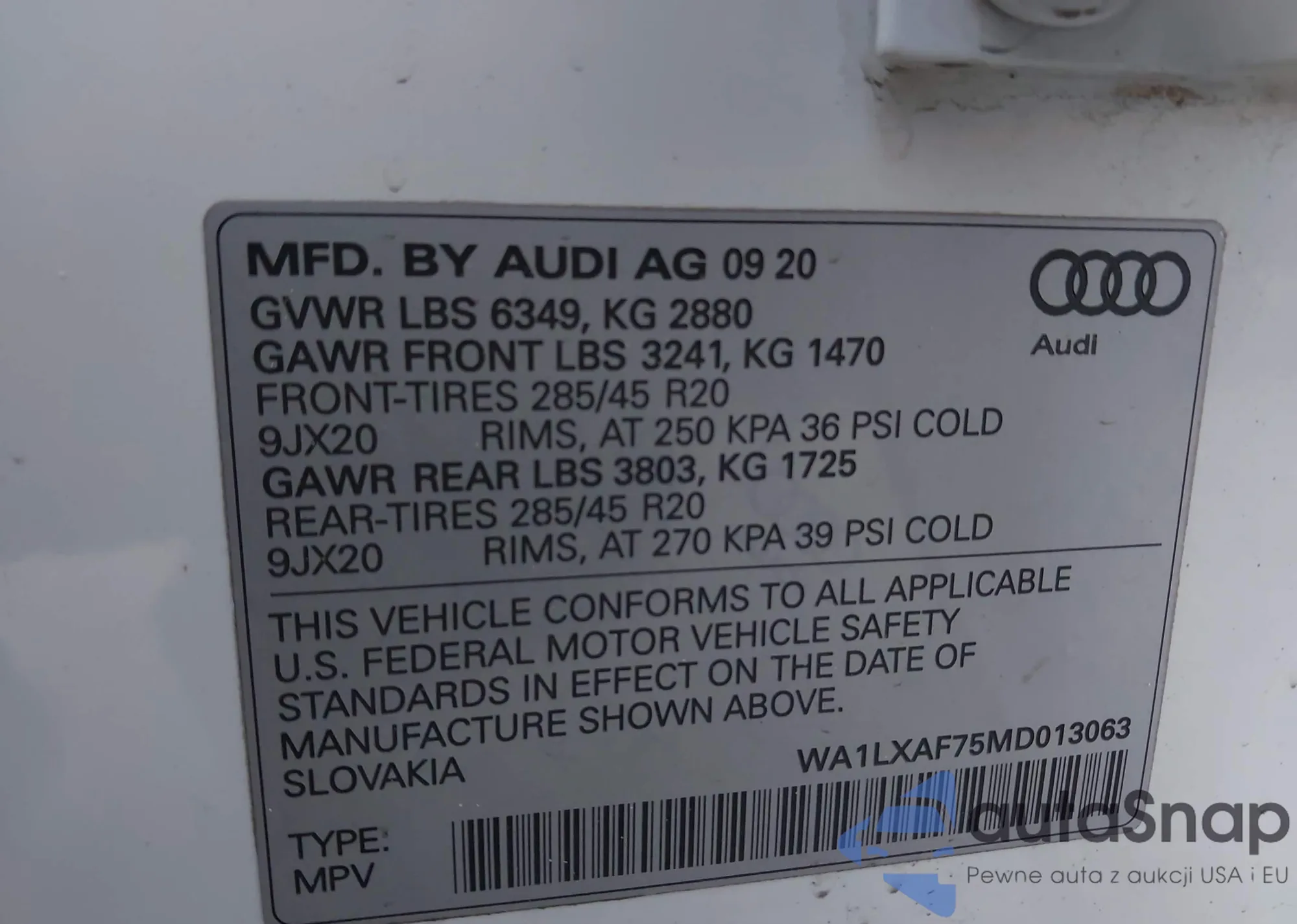 LOT: 44094907 VIN: WA1VAAF77JD017945