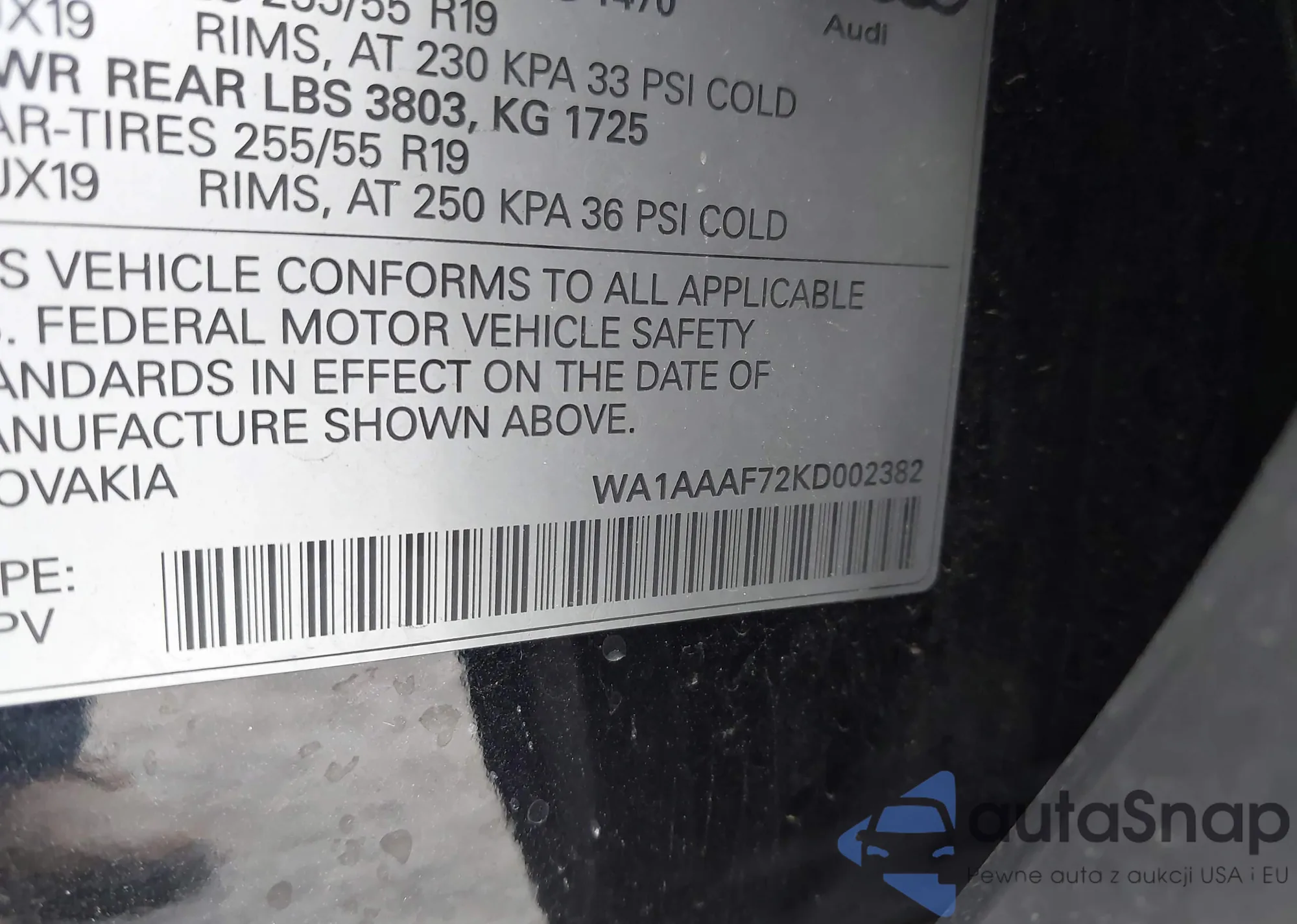 LOT: 44104043 VIN: WA1AAAF72KD002382