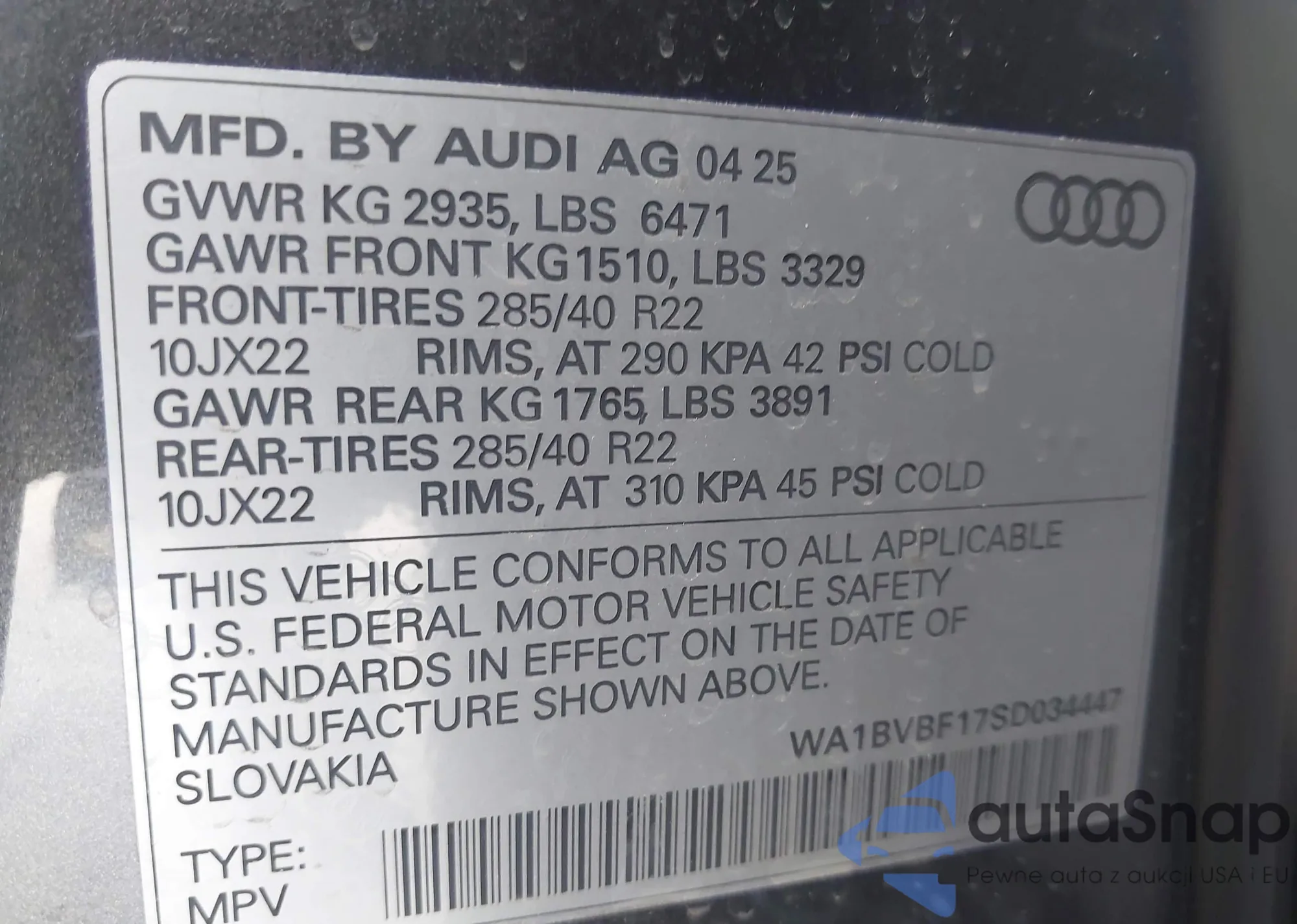 LOT: 44004907 VIN: WA1BVBF17SD034447