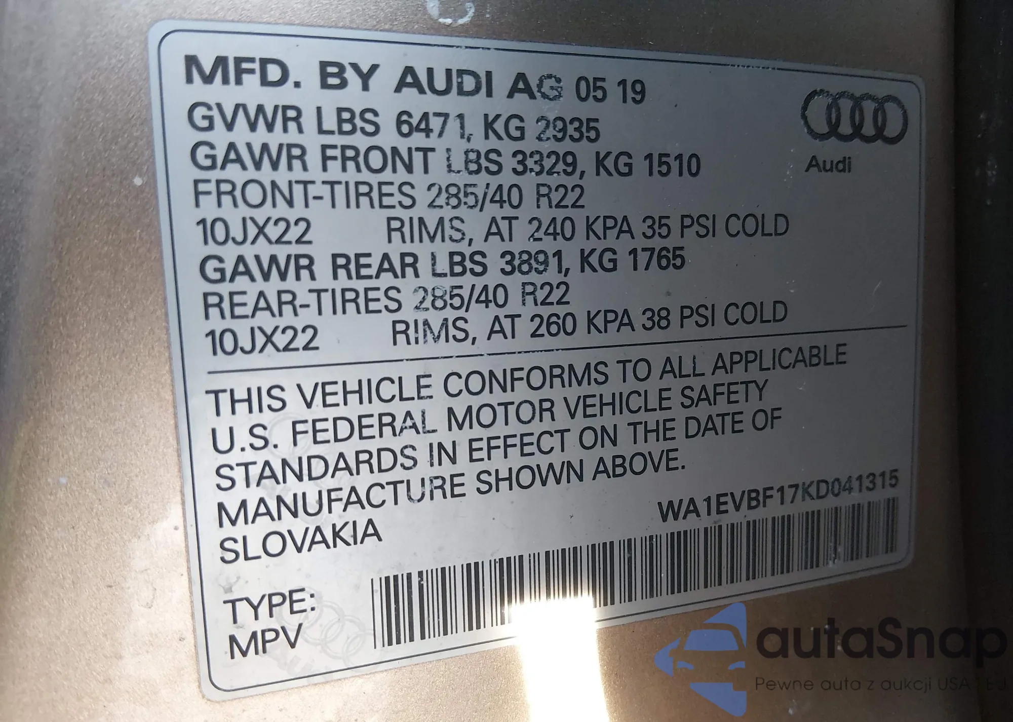 LOT: 44323739 VIN: WA1EVBF17KD041315
