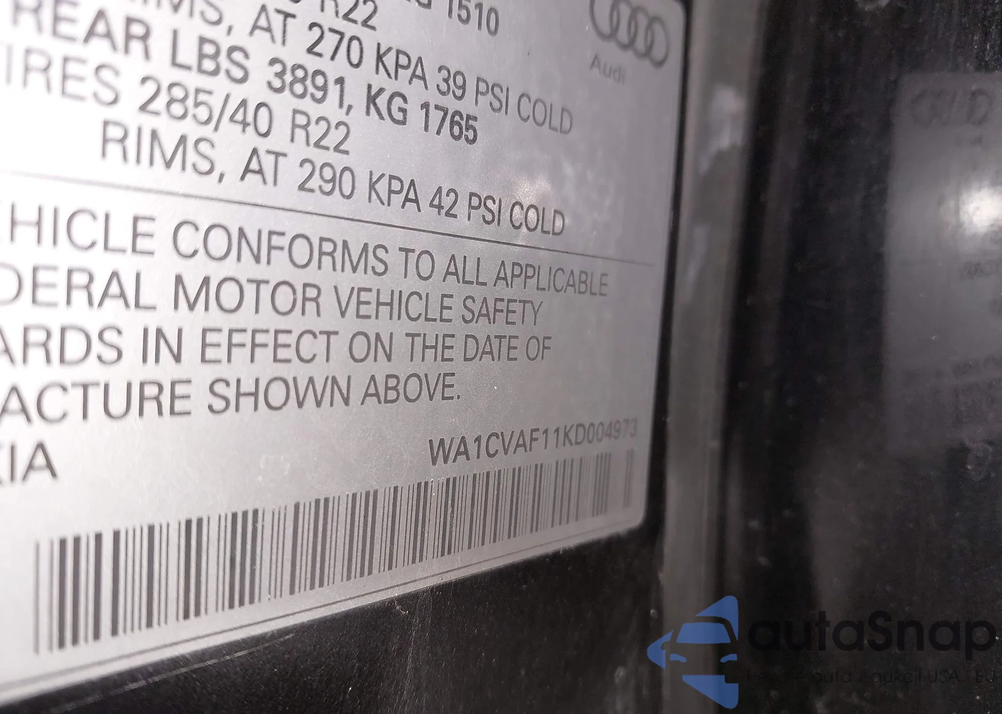 LOT: 44335482 VIN: WA1CVAF11KD004973