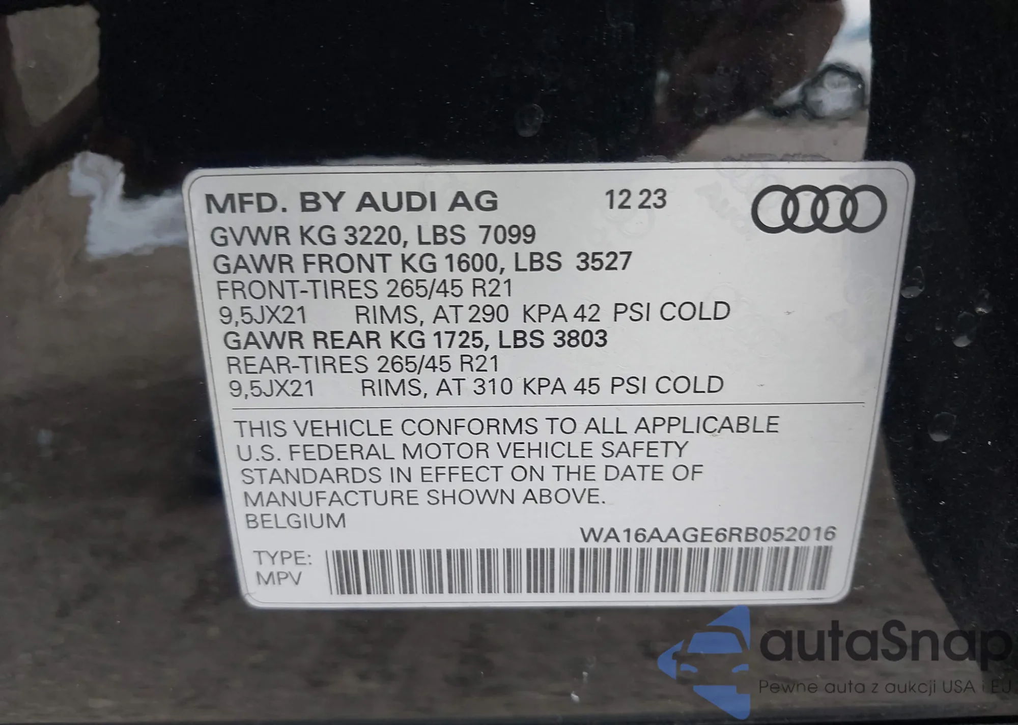 LOT: 44326841 VIN: WA1BVAF16KD038578