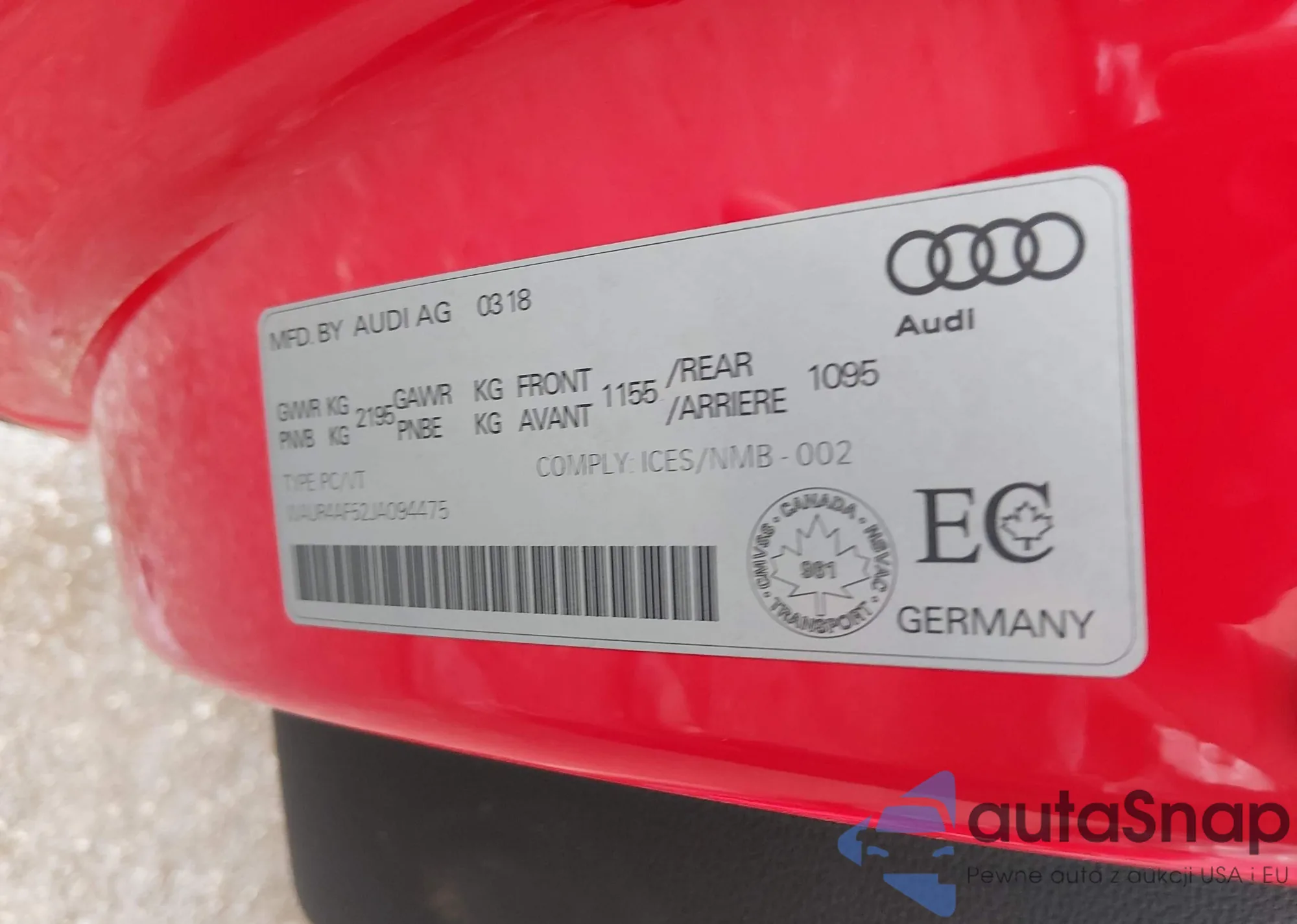 LOT: 44599553 VIN: WAUB4CF5XJA100858