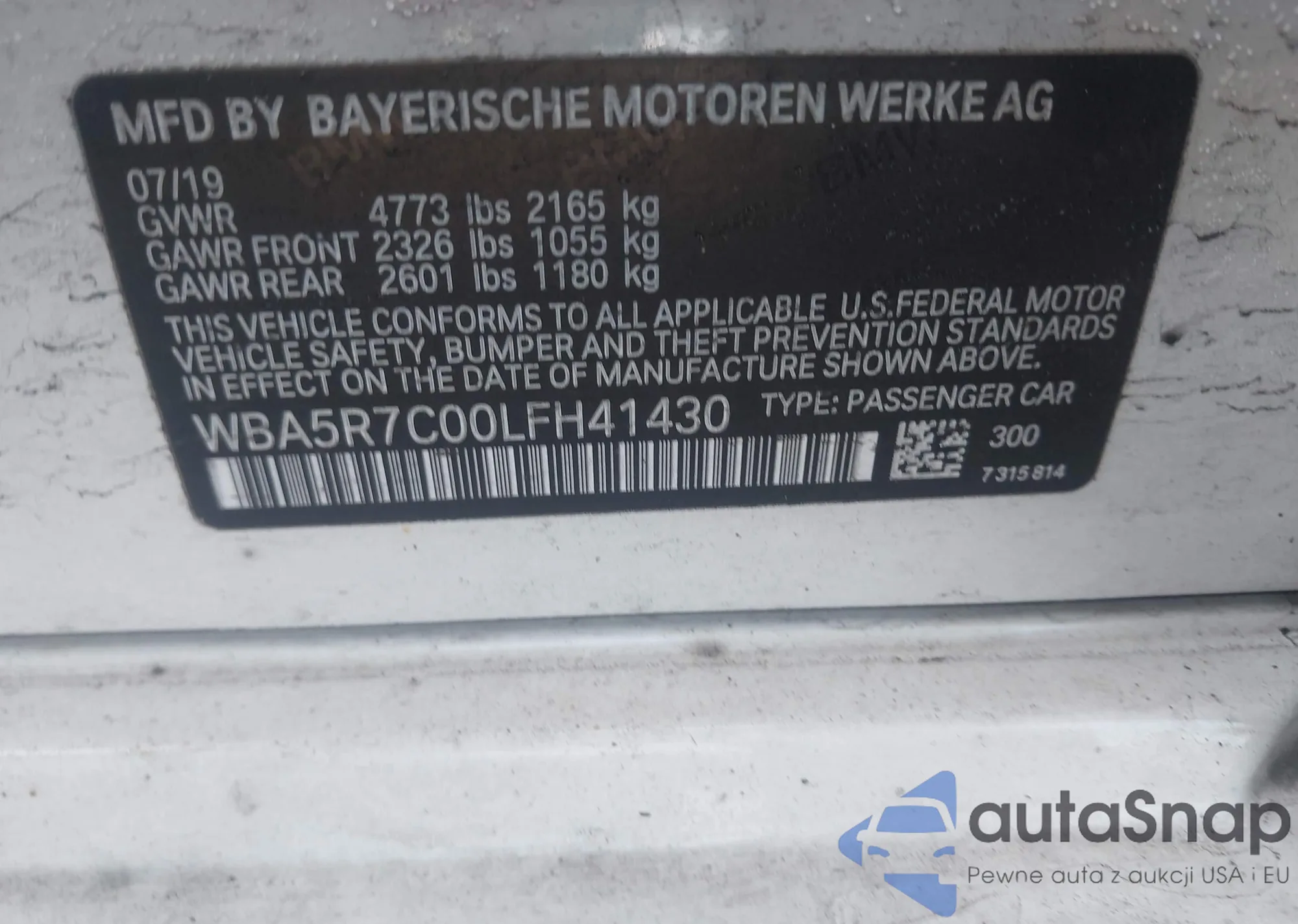 • VIN WBA5R7C00LFH41430