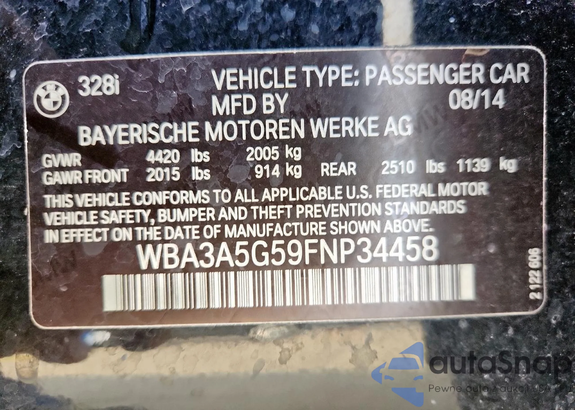 LOT: 44215967 VIN: WBA3B3G57FNR87327