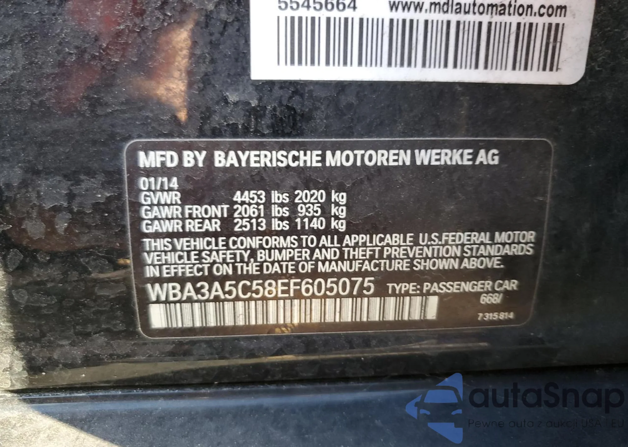 LOT: 75165565 VIN: WBA3B3G50ENR82095