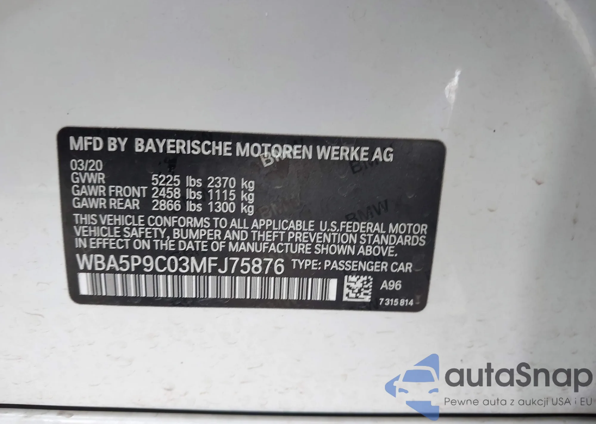 • VIN WBA5P9C03MFJ75876