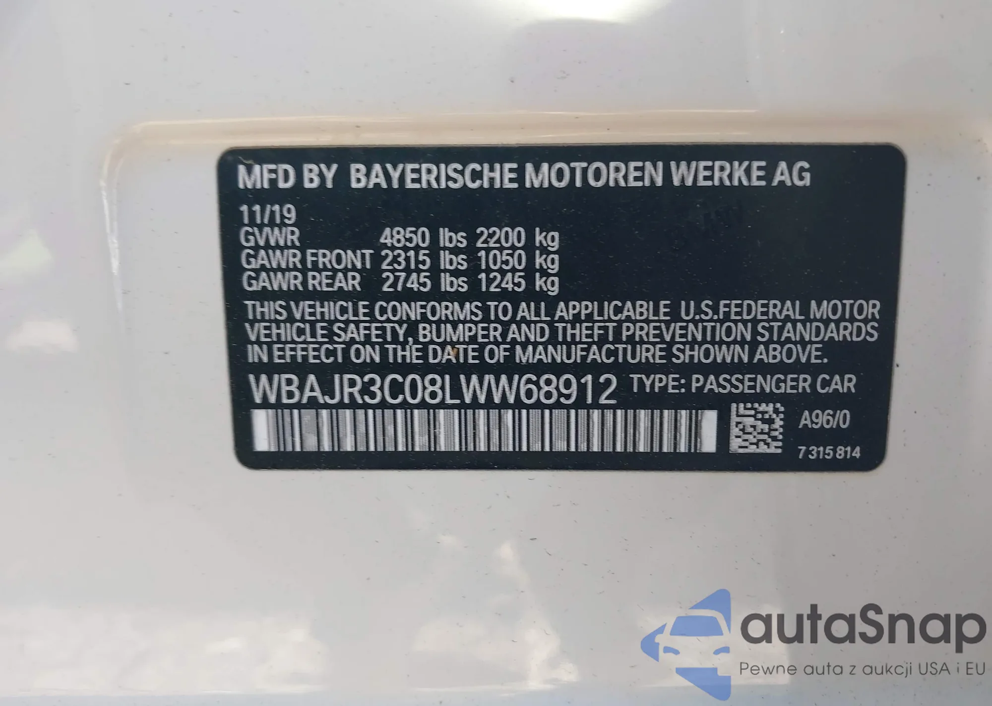 LOT: 44583425 VIN: WBAJR3C08LWW68912