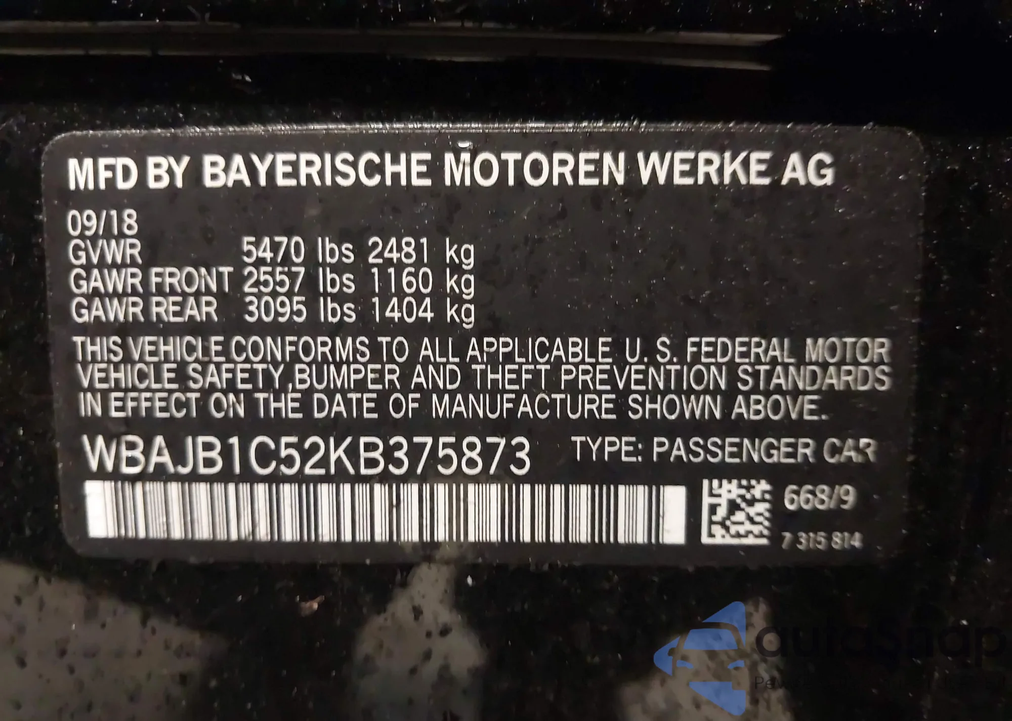 • VIN WBAJB1C52KB375873