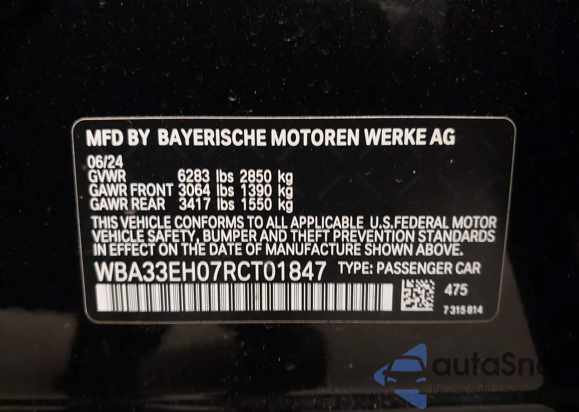 LOT: 43994034 VIN: WBA33EH07RCT01847