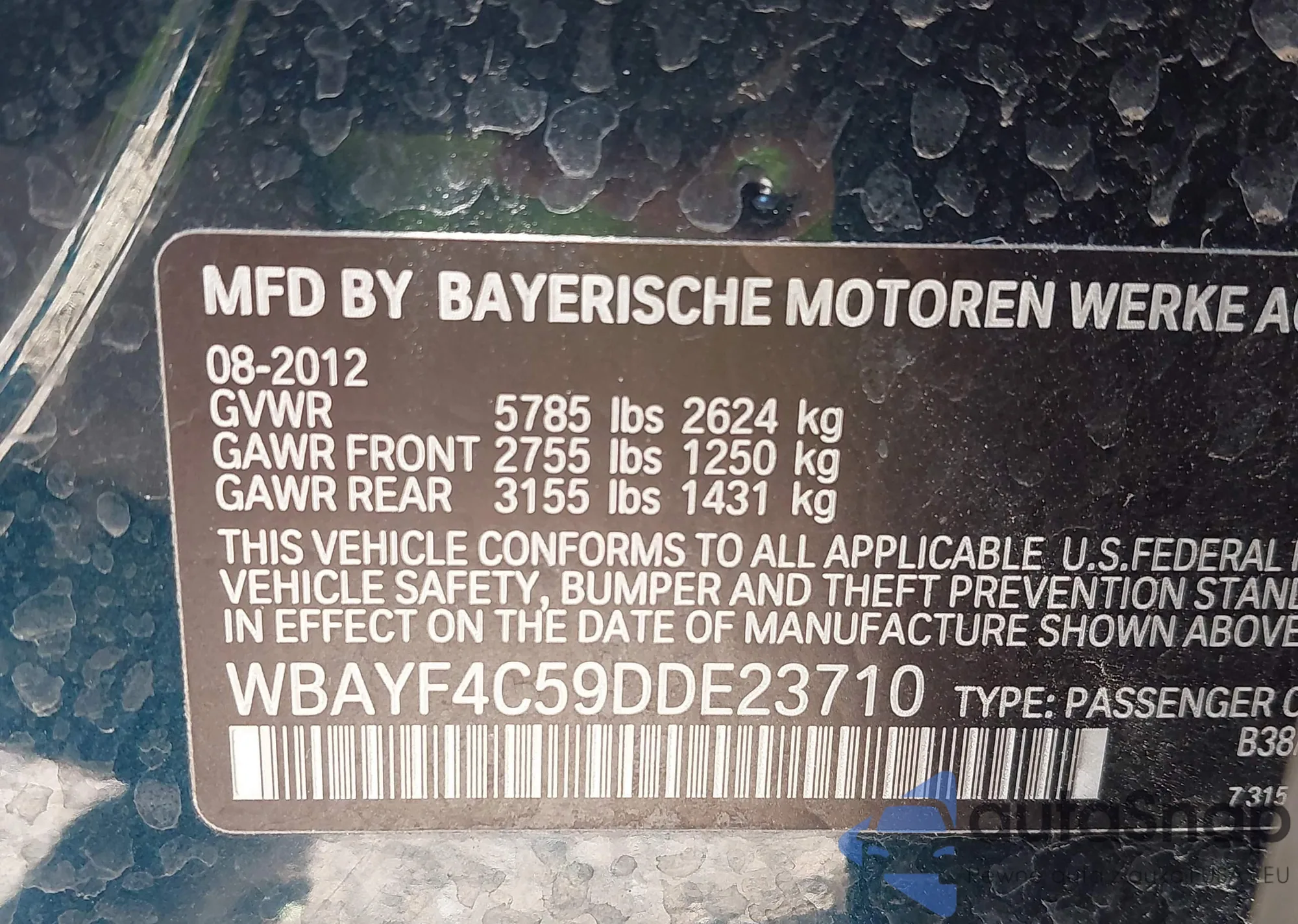 LOT: 43869843 VIN: WBAYF4C59DDE23710